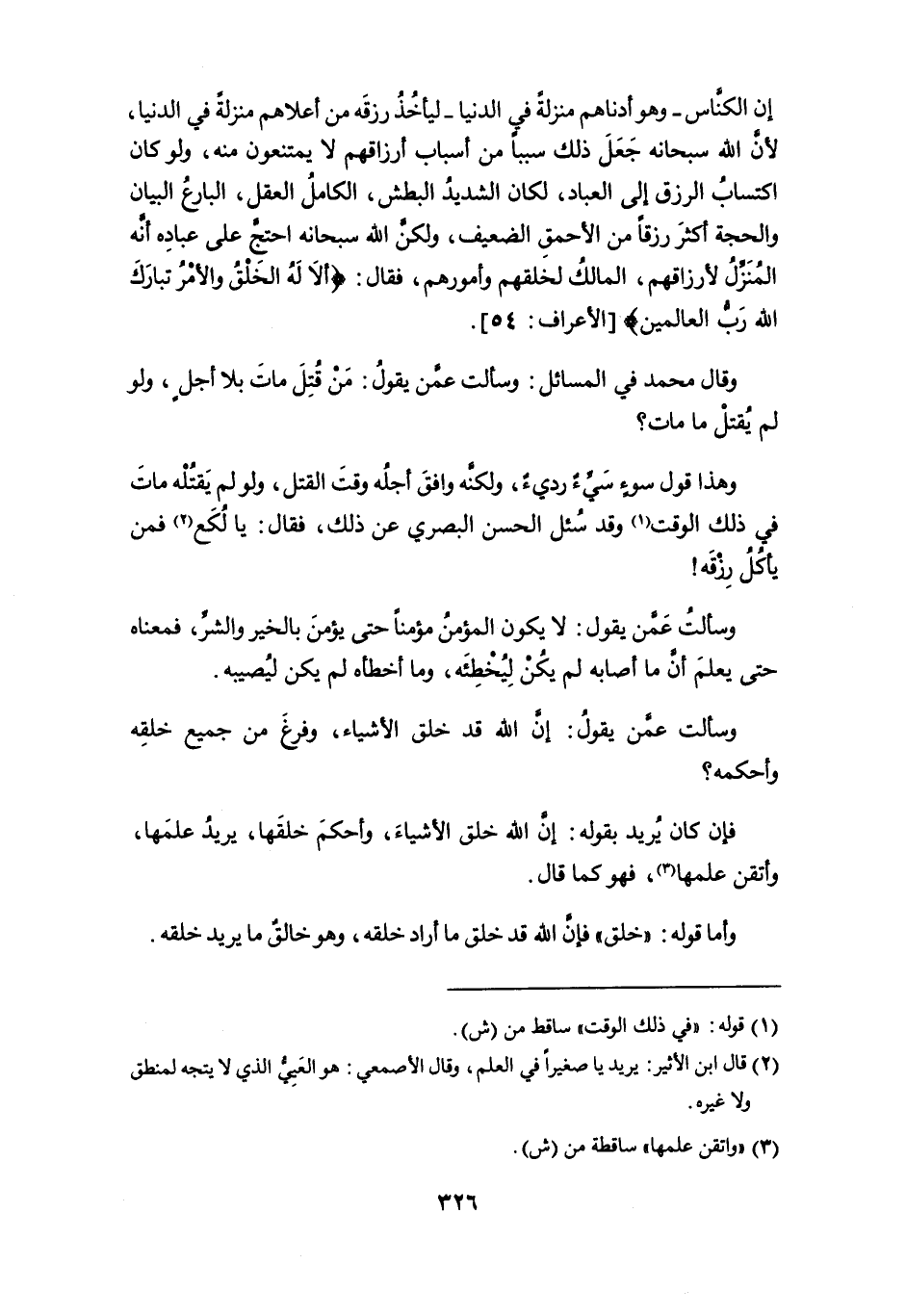 وسألت عمن يقول: لا يكون المؤمن مؤمناً حتى يؤمن بالخير والشر، فمعناه حتى يعلم أن ما أصابه لم يكُن لِيُخطِئَه، وما أخطأه لم يكن ليصيبه.