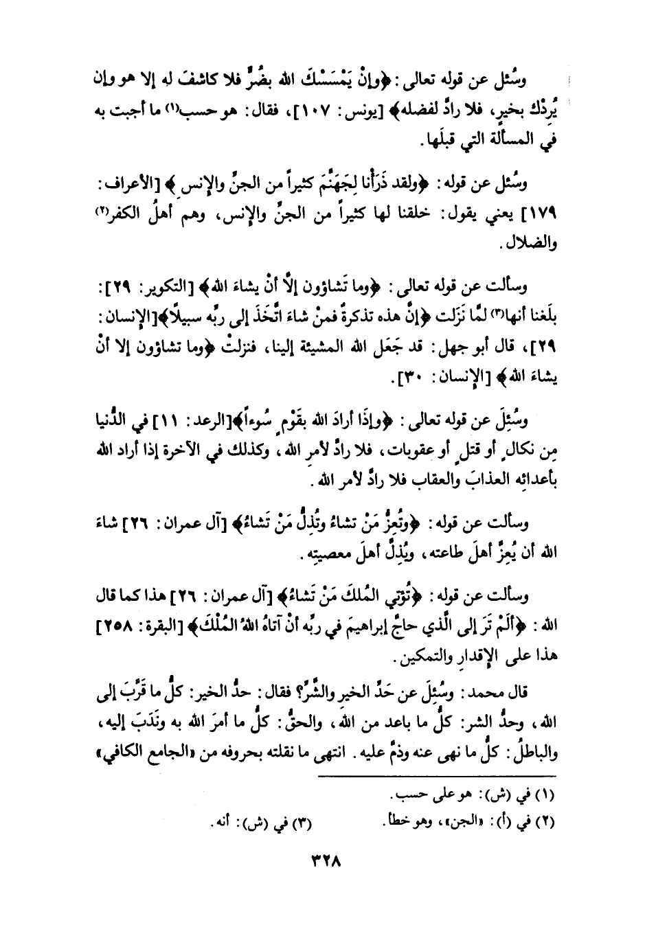 وسُئل عن قوله تعالى: {وَإِنْ يَمْسَسْكَ اللَّهُ بِضُرٍّ فَلَا كَاشِفَ لَهُ إِلَّا هُوَ وَإِنْ يُرِدْكَ بِخَيْرٍ فَلَا رَادَّ لِفَضْلِه} [يونس: 107]، فقال: هو حسب (¬1) ما أجبت به في المسألة التي قبلها.