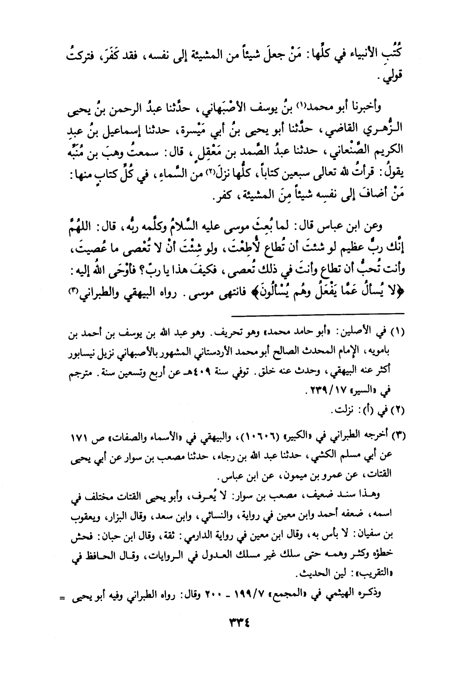 وعن ابن عباس قال: لما بُعِثَ موسى عليه السلام وكلَّمه ربُّه، قال: اللهم إنك ربٌّ عظيم لو شئتَ أن تُطاع لأُطِعْتَ، ولو شئتَ أن لا تُعْصى ما عُصيتَ، وأنت تحب أن تطاع وأنت في ذلك تُعصى، فكيف هذا يا رب؟ فأوحى الله إليه: {لا يُسألُ عمَّا يَفْعَلُ وهُم يُسْألُونَ} فانتهى موسى. رواه البيهقي والطبراني (¬3)