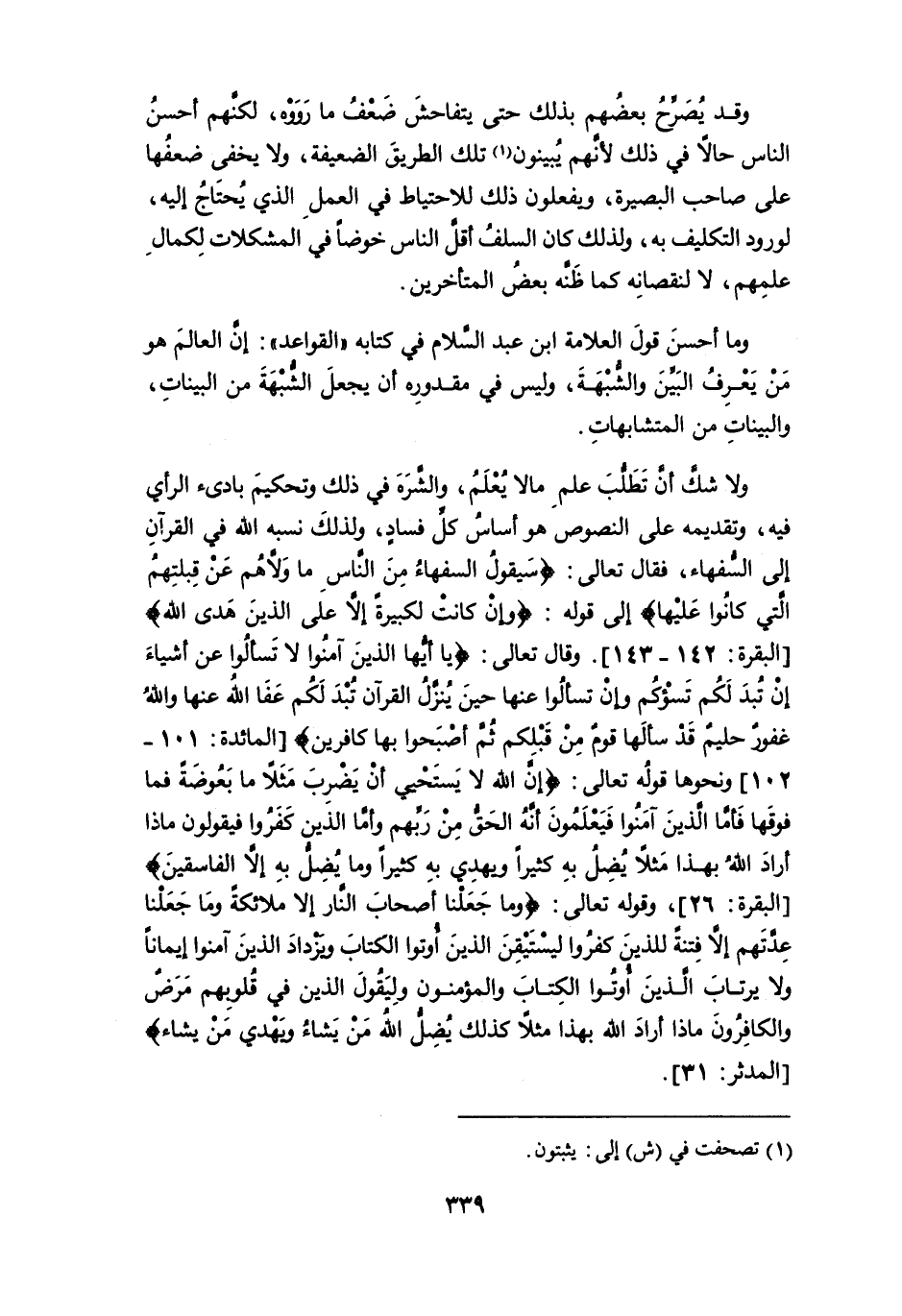 وما أحسن قول العلامة ابن عبد السلام في كتابه " القواعد ": إن العالم هو من يَعْرِفُ البَيِّنَ والشُّبْهَة، وليس في مقدوره أن يجعل الشُبْهَة من البينات، والبينات من المتشابهات.