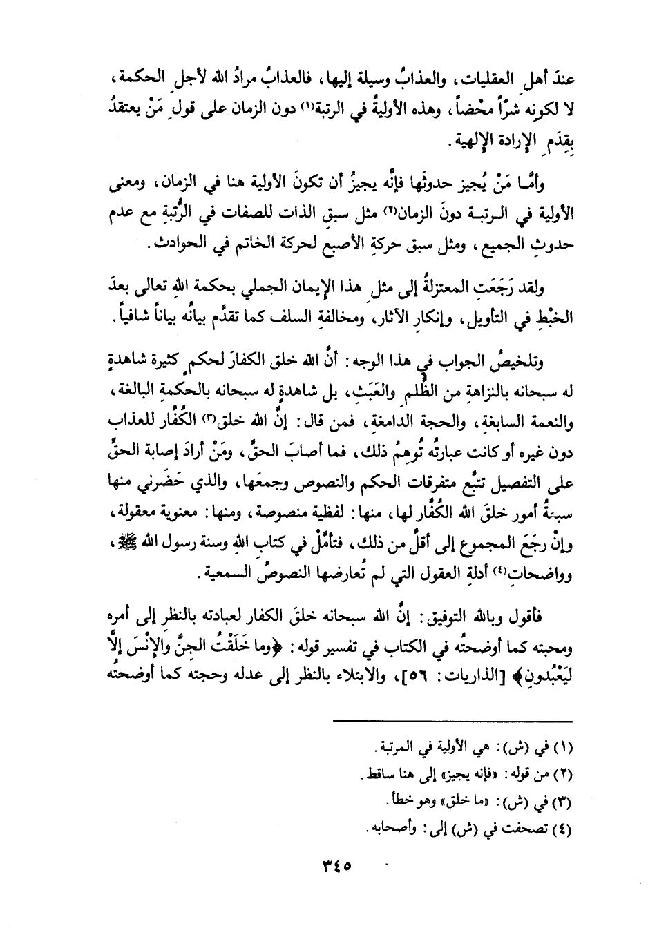 عند أهل العقليات، والعذاب وسيلة إليها، فالعذاب مراد الله لأجل الحكمة، لا لكونه شراً محضاً، وهذه الأولية في الرتبة (¬1) دون الزمان على قول من يعتقد بِقِدَمِ الإرادة الإلهية.
