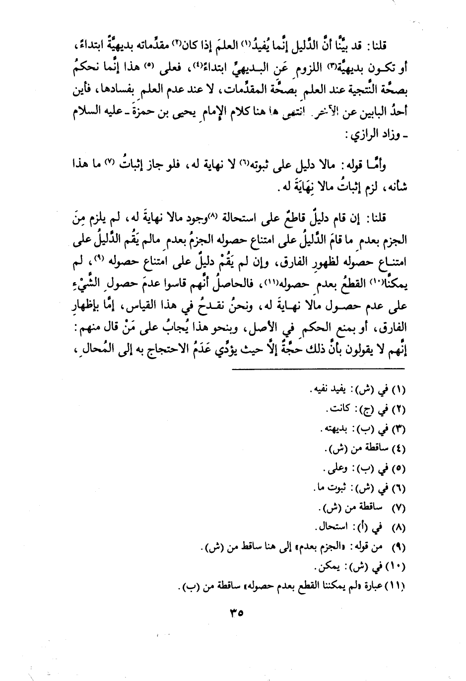 قلنا: قد بينا أن الدليل إنما يفيد (¬1) العلم إذا كان (¬2) مقدماته بديهية ابتداء، أو تكون بديهية (¬3) اللزوم عن البديهي ابتداءً (¬4)، فعلى (¬5) هذا إنما نحكم بصحة النتجية عند العلم بصحة المقدمات، لا عند عدم العلم بفسادها، فأين أحد البابين عن الآخر. انتهى ها هنا كلام الإمام يحيى بن حمزة -عليه السلام- وزاد الرازي: