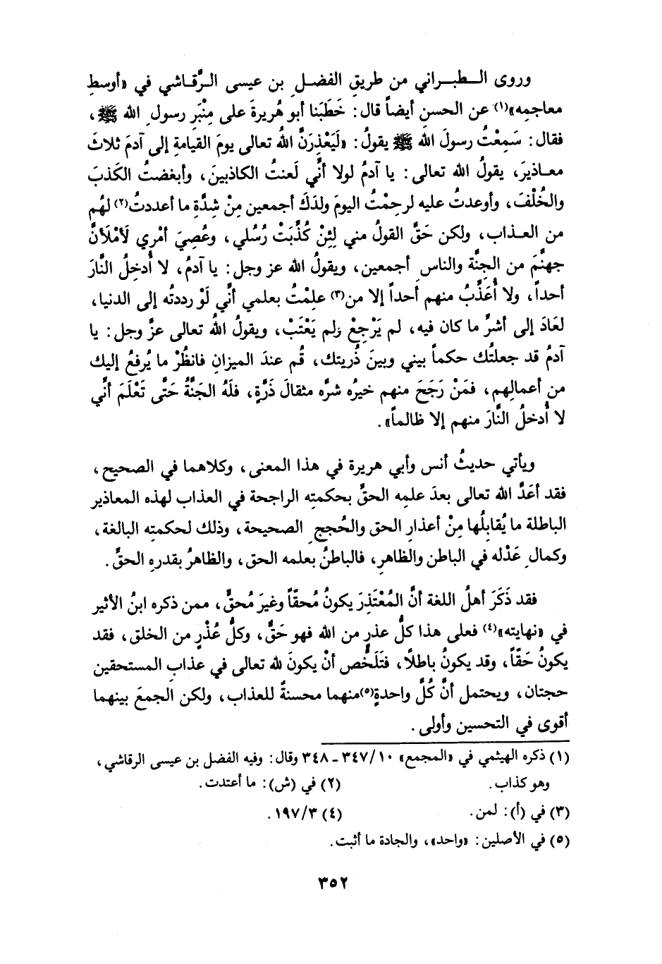 وروى الطبراني من طريق الفضل بن عيسى الرقاشي في " أوسط معاجمه " (¬1) عن الحسن أيضاً قال: خطبنا أبو هريرة على منبر رسول الله - صلى الله عليه وسلم -، فقال: سمعت رسول الله - صلى الله عليه وسلم - يقول: " لَيَعْذِرَنَّ الله تعالى يوم القيامة إلى آدم ثلاث معاذير، يقول الله تعالى: يا آدم لولا أني لعنت الكاذبين، وأبغضت الكذب والخُلْف، وأوعدتُ عليه لرحِمْتُ اليوم ولدَكَ أجمعين من شِدَّة ما أعددت (¬2) لهم من العذاب، ولكن حق القول مني لِئِنْ كُذِّبَتْ رُسُلي، وعُصِيَ أمري لأملانَّ جهنم من الجنة والناس أجمعين، ويقول الله عز وجل: يا آدم، لا أُدخِلُ النار أحداً، ولا أعَذِّب منهم أحداً إلاَّ من (¬3) علمت بعلمي أني لو رددته إلى الدنيا، لعاد إلى أشرِّ ما كان فيه، لم يرجع ولم يَعْتَبْ، ويقول الله تعالى عز وجل: يا آدم قد جعلتك حكماً بيني وبين ذُريتك، قُم عند الميزان فانظر ما يُرفعُ إليك من أعمالهم، فمن رَجَحَ منهم خيره شره مثقال ذرَّةٍ، فله الجنة حتى تعلم أني لا أُدخلُ النار منهم إلاَّ ظالماً ".