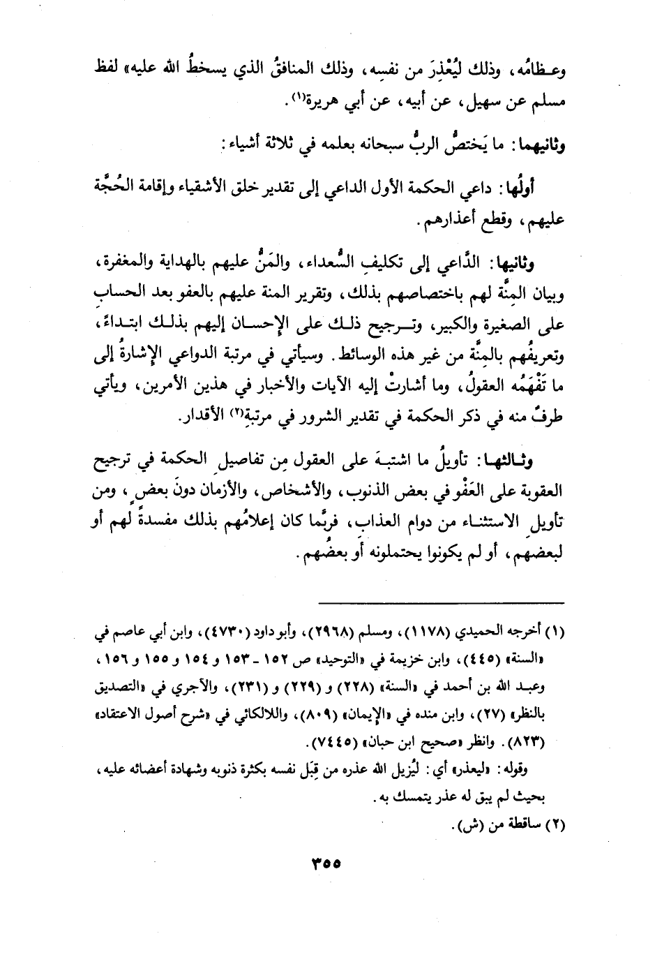 وثالثها: تأويل ما اشتبه على العقول من تفاصيل الحكمة في ترجيح العقوبة على العفو في بعض الذنوب، والأشخاص، والأزمان دون بعض، ومن تأويل الاستثناء من دوام العذاب، فربما كان إعلامهم بذلك مفسدةً لهم أو لبعضهم، أو لم يكونوا يحتملونه أو بعضهم.