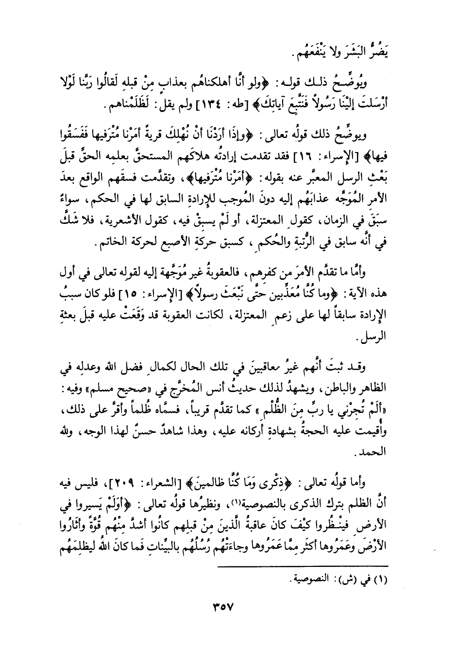 ويوضح ذلك قوله تعالى: {وَإِذَا أَرَدْنَا أَنْ نُهْلِكَ قَرْيَةً أَمَرْنَا مُتْرَفِيهَا فَفَسَقُوا فِيهَا} [الإسراء: 16] فقد تقدمت إرادته هلاكهم المستحق بعلمِه الحق قبل بعث الرسل المعبَّر عنه بقوله: {أمَرْنا مُتْرَفيها}، وتقدَّمت فسقهم الواقع بعد الأمر المُوَجَّه عذابهم إليه دون الموجب للإرادة السابق لها في الحكم، سواء سبق في الزمان، كقول المعتزلة، أو لم يسبق فيه، كقول الأشعرية، فلا شكَّ في أنه سابق في الرتبة والحكم، كسبق حركة الأصبع لحركة الخاتم.