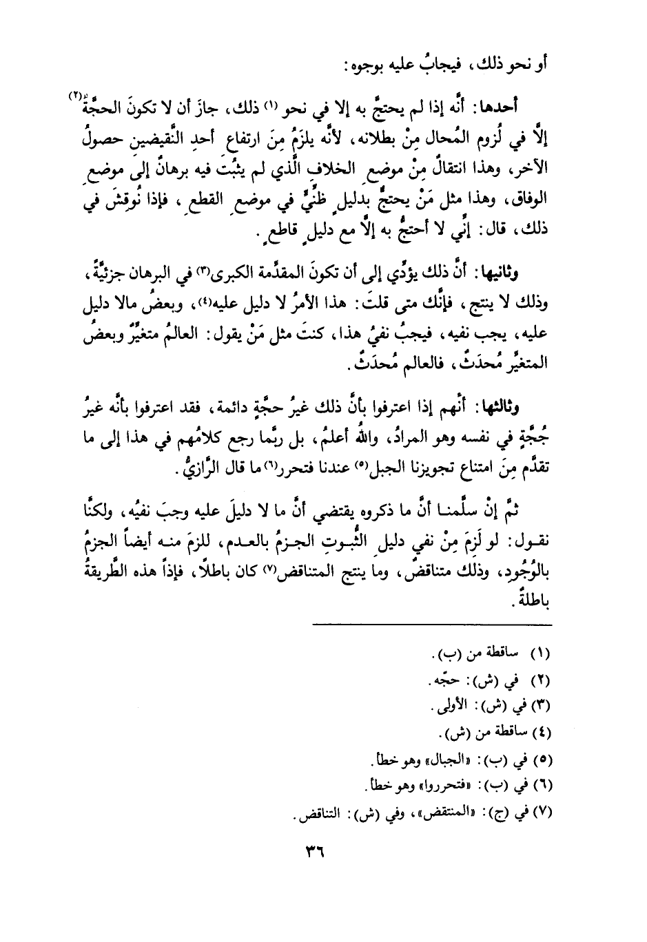 أحدها: أنه إذا لم يحتجَّ به إلاَّ في نحو (¬1) ذلك، جاز أن لا تكون الحجة (¬2) إلا في لزوم المحال من بطلانه، لأنه يلزم من ارتفاع أحد النقيضين حصول الآخر، وهذا انتقال من موضع الخلاف الذي لم يثبت فيه برهانٌ إلى موضع الوفاق، وهذا مثل من يحتج بدليلٍ ظنِّي في موضع القطع، فإذا نُوقِشَ في ذلك، قال: إني لا أحتجُّ به إلاَّ مع دليلٍ قاطعٍ.