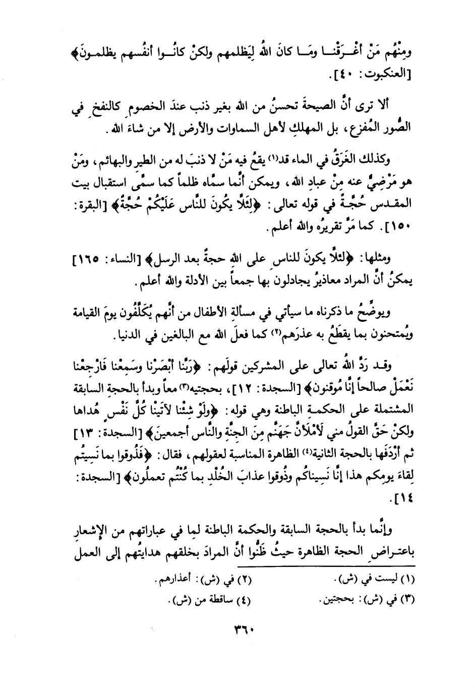 وقد رد الله تعالى على المشركين قولهم: {رَبَّنَا أَبْصَرْنَا وَسَمِعْنَا فَارْجِعْنَا نَعْمَلْ صَالِحًا إِنَّا مُوقِنُون} [السجدة: 12]، بحجتيه (¬3) معاً وبدأ بالحجة السابقة المشتملة على الحكمة الباطنة وهي قوله: {وَلَوْ شِئْنَا لَآتَيْنَا كُلَّ نَفْسٍ هُدَاهَا وَلَكِنْ حَقَّ الْقَوْلُ مِنِّي لَأَمْلَأَنَّ جَهَنَّمَ مِنَ الْجِنَّةِ وَالنَّاسِ أَجْمَعِين} [السجدة: 13] ثم أردفها بالحجة الثانية (¬4) الظاهرة المناسبة لعقولهم، فقال: {فَذُوقُوا بِمَا نَسِيتُمْ لِقَاءَ يَوْمِكُمْ هَذَا إِنَّا نَسِينَاكُمْ وَذُوقُوا عَذَابَ الْخُلْدِ بِمَا كُنْتُمْ تَعْمَلُون} [السجدة: 14].