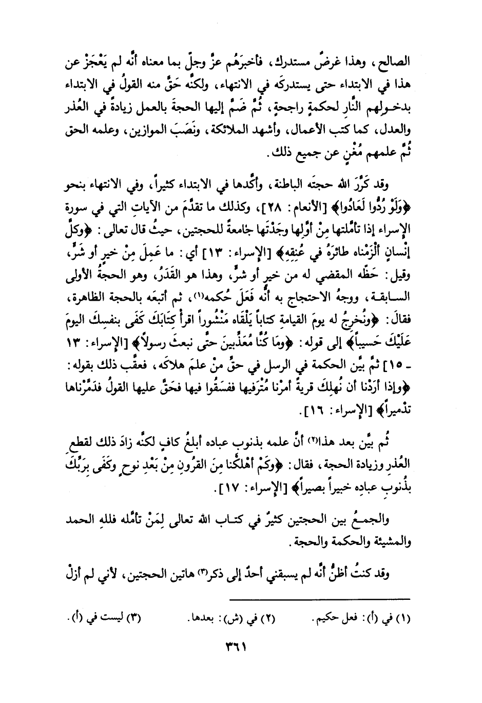 وقد كرر الله حجته الباطنة، وأكدها في الابتداء كثيراً، وفي الانتهاء بنحو {وَلَوْ رُدُّوا لَعَادُوا} [الأنعام: 28]، وكذلك ما تقدم من الآيات التي في سورة الإسراء إذا تأمَّلتها من أولها وجدتها جامعةً للحجتين، حيث قال تعالى: {وَكُلَّ إِنْسَانٍ أَلْزَمْنَاهُ طَائِرَهُ فِي عُنُقِهِ} [الإسراء: 13] أي: ما عَمِلَ من خيرٍ أو شرٍّ، وقيل: حظه المقضي له من خير أو شر، وهذا هو القدر، وهو الحجة الأولى السابقة، ووجه الاحتجاج به أنه فعل حُكمه (¬1)، ثم أتبعه بالحجة الظاهرة، فقال: {وَنُخْرِجُ لَهُ يَوْمَ الْقِيَامَةِ كِتَابًا يَلْقَاهُ مَنْشُورًا (13) اقْرَأْ كِتَابَكَ كَفَى بِنَفْسِكَ الْيَوْمَ عَلَيْكَ حَسِيبًا} إلى قوله: {وَمَا كُنَّا مُعَذِّبِينَ حَتَّى نَبْعَثَ رَسُولًا} [الإسراء: 13 - 15] ثم بين الحكمة في الرسل في حق من علم هلاكه، فعقَّب ذلك بقوله: {وَإِذَا أَرَدْنَا أَنْ نُهْلِكَ قَرْيَةً أَمَرْنَا مُتْرَفِيهَا فَفَسَقُوا فِيهَا فَحَقَّ عَلَيْهَا الْقَوْلُ فَدَمَّرْنَاهَا تَدْمِيرًا} [الإسراء: 16].