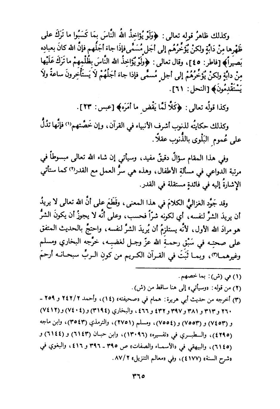 وقد جوَّد الغزالي الكلام في هذا المعنى، وقطع على أن الله تعالى لا يريد أن يريد الشر لنفسه، أي لكونه شراً فحسب، وعلى أنه لا يجوز أن يكون الشر هو مراد الله الأول، لأنه يستلزم أن يريد الشر لنفسه، واحتج بالحديث المتفق على صحته في سبق رحمة الله عز وجل لغضبه، خرجه البخاري ومسلم وغيرهما (¬3)، وبما ثبت في القرآن الكريم من كون الرب سبحانه أرحم
