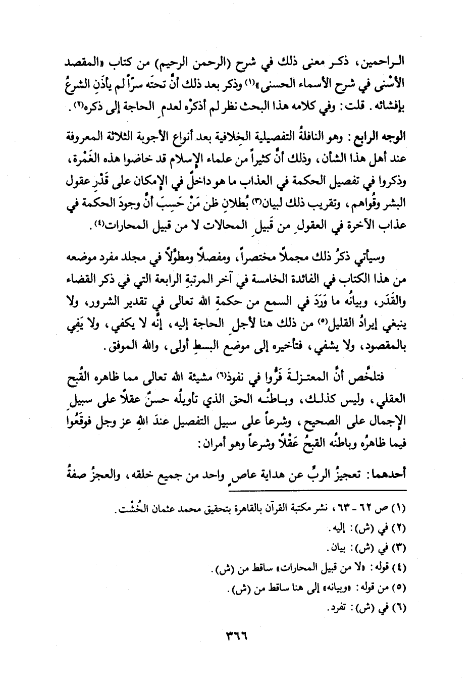 الوجه الرابع: وهو النافلة التفصيلية الخلافية بعد أنواع الأجوبة الثلاثة المعروفة عند أهل هذا الشأن، وذلك أن كثيراً من علماء الإسلام قد خاضوا هذه الغمرة، وذكروا في تفصيل الحكمة في العذاب ما هو داخلٌ في الإمكان على قدر عقول البشر وقُواهم، وتقريب ذلك لبيان (¬3) بطلان ظن من حسب أن وجود الحكمة في عذاب الآخرة في العقول من قبيل المحالات لا من قبيل المحارات (¬4).