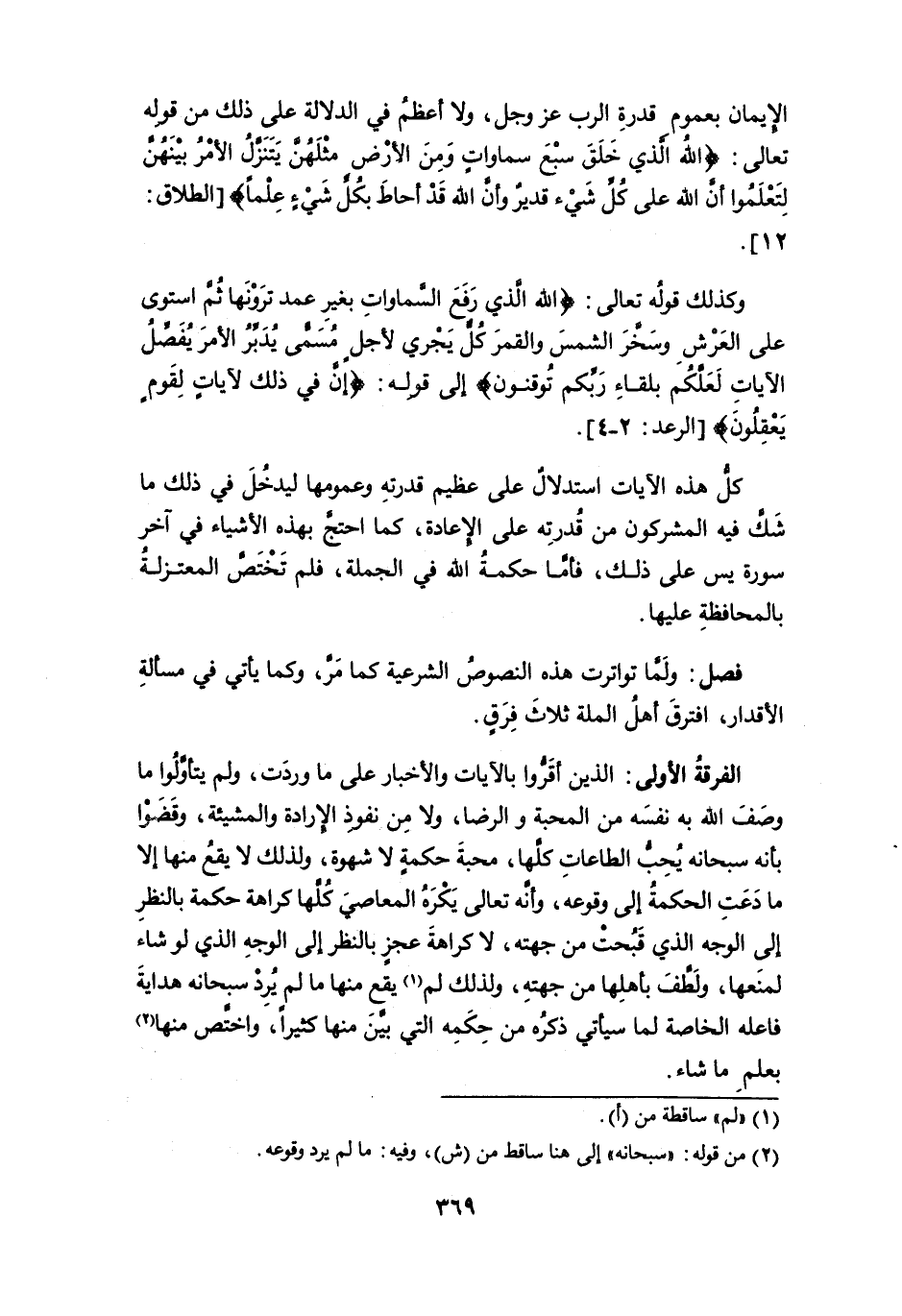 الفرقة الأولى: الذين أقروا بالآيات والأخبار على ما وردت، ولم يتأوَّلُوا ما وصف الله به نفسه من المحبة والرضا، ولا من نفوذ الإرادة والمشيئة، وقضوا بأنه سبحانه يحب الطاعات كلها، محبة حكمةٍ لا شهوة، ولذلك لا يقع منها إلا ما دعتِ الحكمة إلى وقوعه، وأنه تعالى يكره المعاصي كلها كراهة حكمة بالنظر إلى الوجه الذي قَبُحتْ من جهته، لا كراهة عجزٍ بالنظر إلى الوجه الذي لو شاء لمنعها، ولطف بأهلها من جهته، ولذلك لم (¬1) يقع منها ما لم يُرِدْ سبحانه هداية فاعله الخاصة لما سيأتي ذكره من حكمه التي بين منها كثيراً، واختص منها (¬2) بعلم ما شاء.