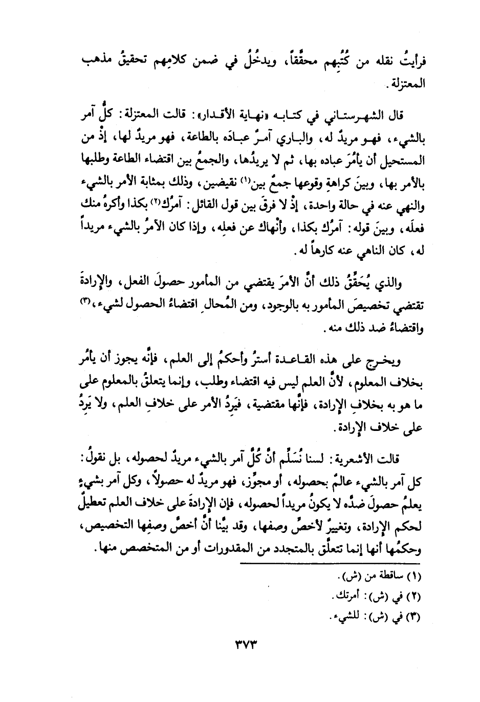 قال الشهرستاني في كتابه " نهاية الأقدار ": قالت المعتزلة: كلُّ آمر بالشيء، فهو مريدٌ له، والباري آمرٌ عباده بالطاعة، فهو مريدٌ لها، إذ من المستحيل أن يأمُرَ عباده بها، ثم لا يريدها، والجمع بين اقتضاء الطاعة وطلبها بالأمر بها، وبين كراهة وقوعها جمعٌ بين (¬1) نقيضين، وذلك بمثابة الأمر بالشيء والنهي عنه في حالة واحدة، إذ لا فرق بين قول القائل: آمرُك (¬2) بكذا وكرهُ منك فعله، وبين قوله: آمرُك بكذا، وأنْهاك عن فعله، وإذا كان الآمرُ بالشيء مريداً له، كان الناهي عنه كارهاً له.