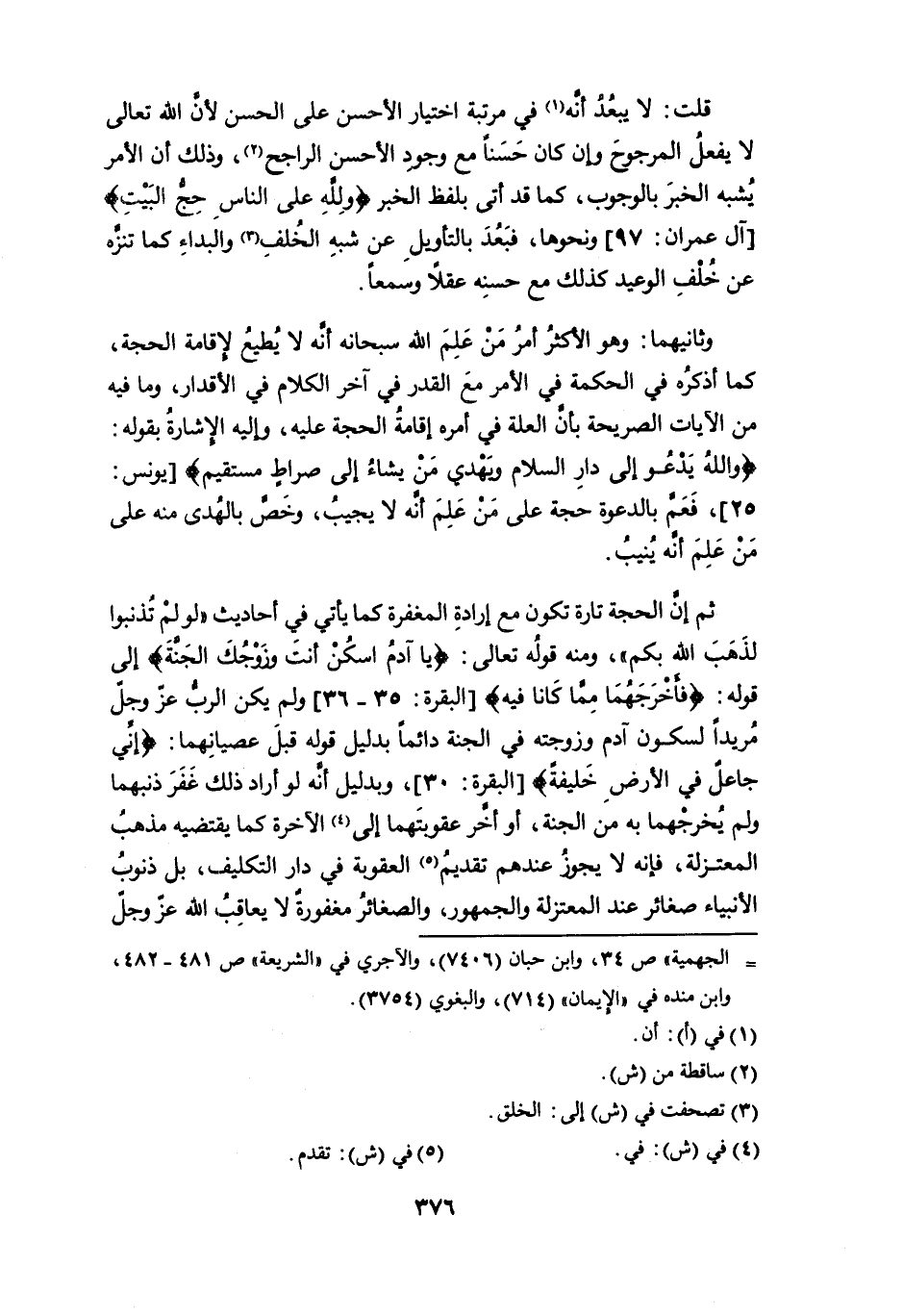 ثم إن الحجة تارة تكون مع إرادة المغفرة كما يأتي في أحاديث " لو لم تُذنبوا لذهب الله بكم "، ومنه قوله تعالى: {يَا آدَمُ اسْكُنْ أَنْتَ وَزَوْجُكَ الْجَنَّة} إلى قوله: {فَأَخْرَجَهُمَا مِمَّا كَانَا فِيه} [البقرة: 35 - 36] ولم يكن الرب عز وجل مُريداً لسكون آدم وزوجته في الجنة دائماً بدليل قوله قبل عصيانهما: {إني جاعلٌ في الأرض خليفةً} [البقرة: 30]، وبدليل أنه لو أراد ذلك غفر ذنبهما ولم يُخرجهما به من الجنة، أو أخَّر عقوبتهما إلى (¬4) الآخرة كما يقتضيه مذهبُ المعتزلة، فإنه لا يجوز عندهم تقديم (¬5) العقوبة في دار التكليف، بل ذنوب الأنبياء صغائر عند المعتزلة والجمهور، والصغائرُ مغفورةٌ لا يعاقب الله عز وجل