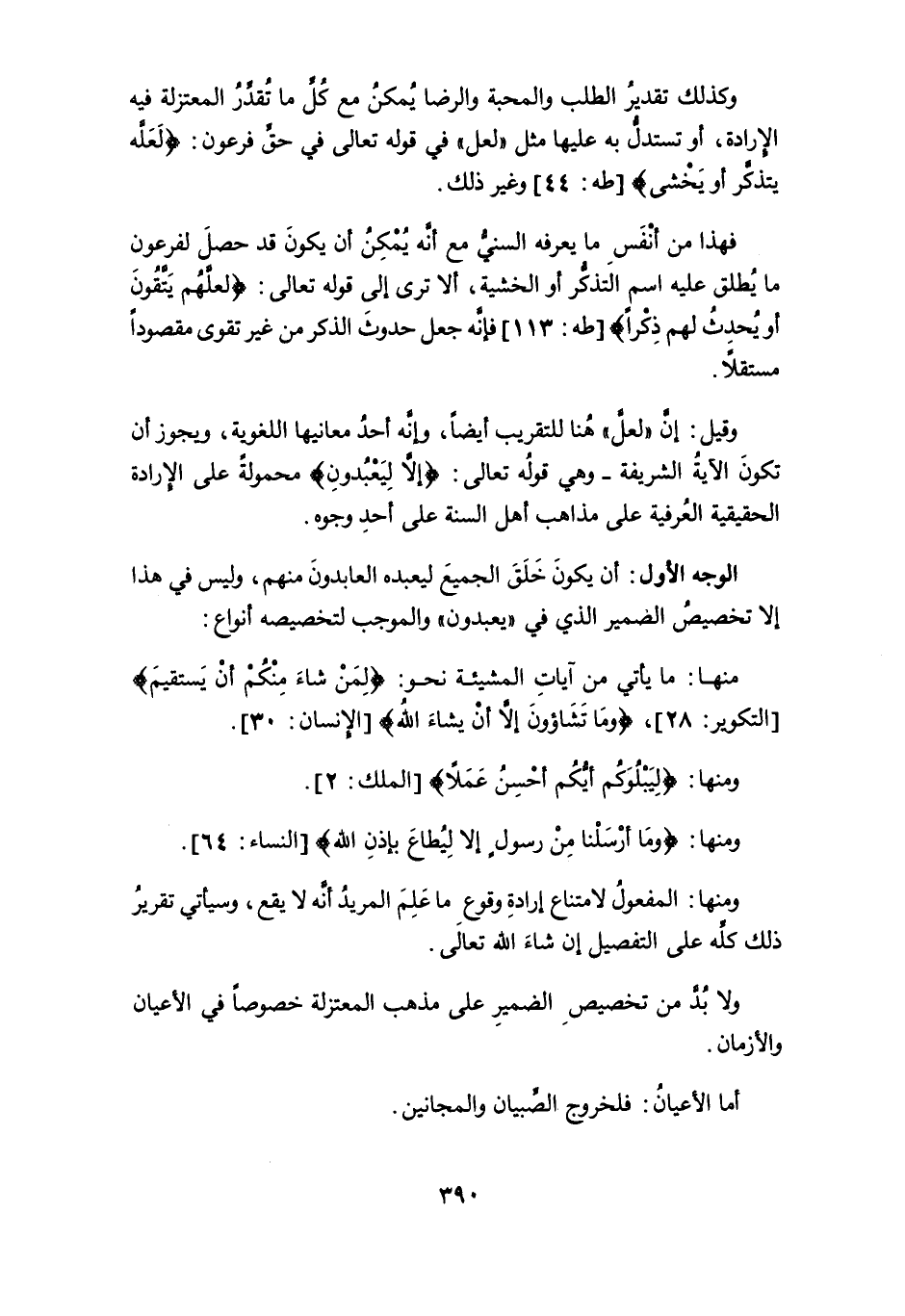 ولا بد من تخصيص الضمير على مذهب المعتزلة خصوصاً في الأعيان والأزمان.