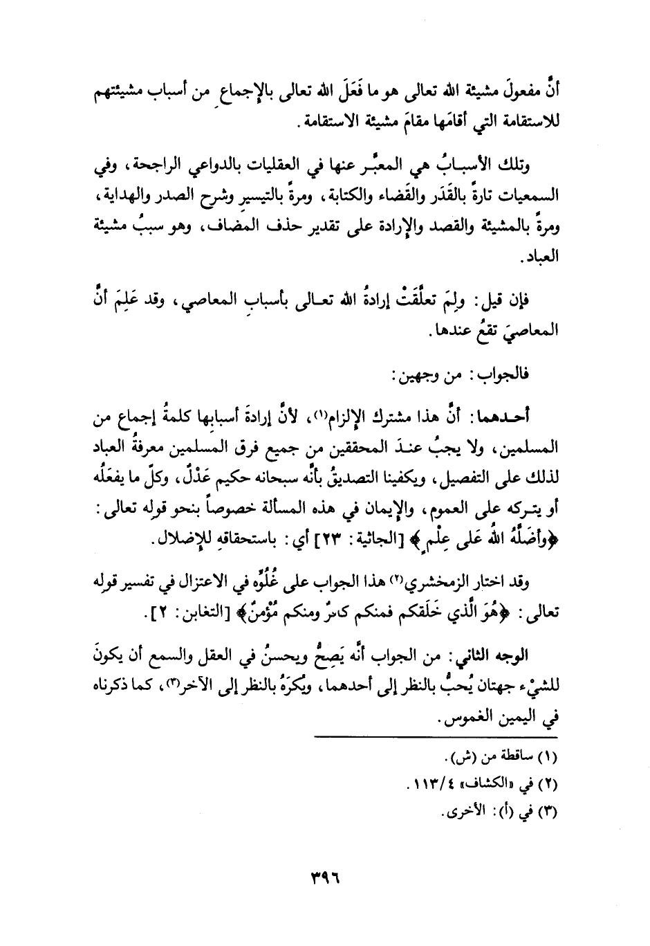 وتلك الأسباب هي المعبر عنها في العقليات بالدواعي الراجحة، وفي السمعيات تارةً بالقدر والقضاء والكتابة، ومرة بالتيسير وشرح الصدر والهداية، ومرة بالمشيئة والقصد والإرادة على تقدير حذف المضاف، وهو سبب مشيئة العباد.