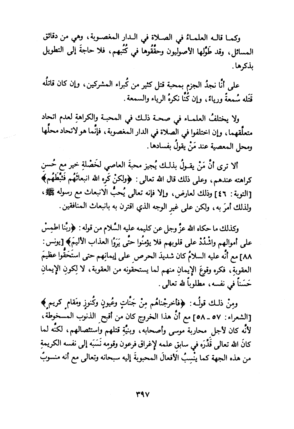 ولا يختلف العلماء في صحة ذلك في المحبة والكراهةِ لعدم اتحاد متعلقهما، وإن اختلفوا في الصلاه في الدار المغصوبة، فإنما هو لاتحاد محلِّها ومحل المعصية عند من يقولُ بفسادها.