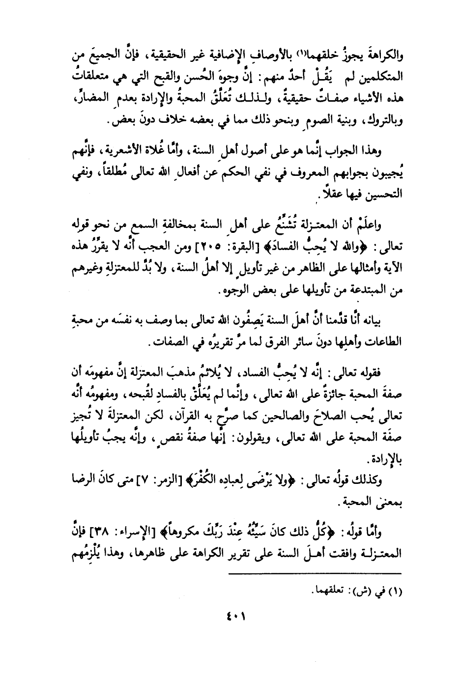 واعلم أن المعتزلة تُشَنِّع على أهل السنة بمخالفة السمع من نحو قوله تعالى: {والله لا يُحِبُّ الفساد} [البقرة: 205] ومن العجب أنه لا يقرر هذه الآية وأمثالها على الظاهر من غير تأويل إلاَّ أهل السنة، ولا بُدَّ للمعتزلة وغيرهم من المبتدعة من تأويلها على بعض الوجوه.