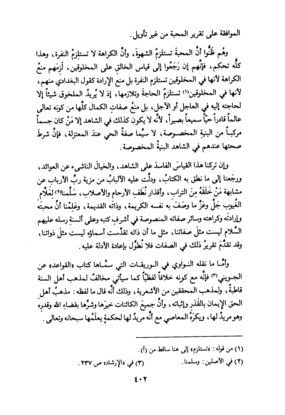 وأما ما نقله النواوي في الوريقات التي سمَّاها كتاب " القواعد " عن الجويني (¬3) فإنه مع كونه خلافاً لفظياً كما سيأتي مخالف لمذهب أهل السنة قاطبة، ولمذهب المحققين من الأشعرية، وذلك أنه قال ما لفظه: مذهب أهل الحق الإيمان بالقدر وإثباته، وأن جميع الكائنات خيرها وشرها بقضاء الله وقدره وهو مريدٌ لها، ويكرَهُ المعاصي مع أنه مريدٌ لها لحكمةٍ يعلمها سبحانه وتعالى.