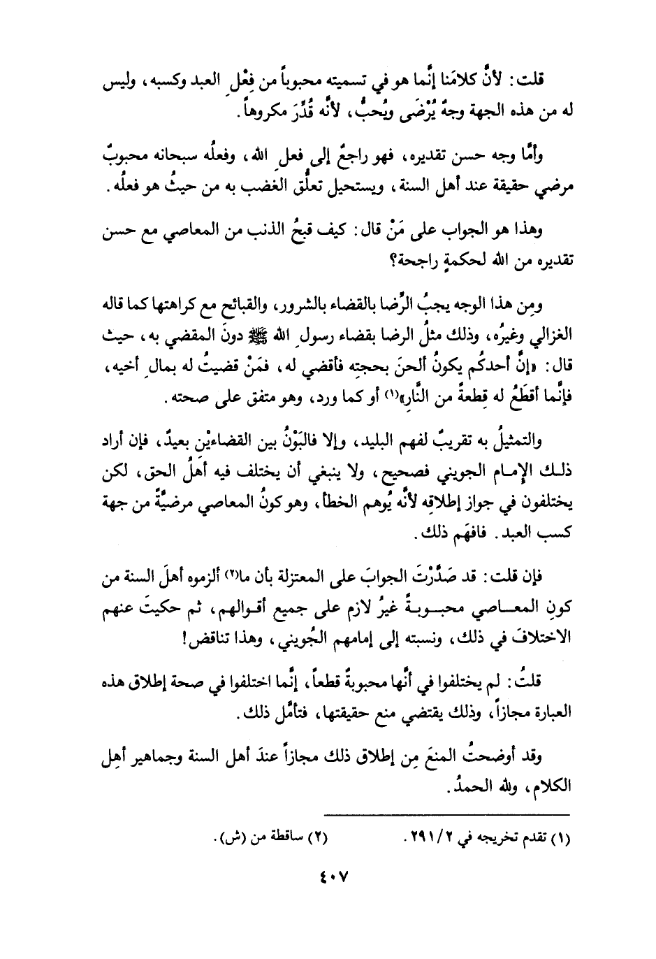 والتمثيل به تقريبٌ لفهم البليد، وإلا فالبَوْنَ بين القضاءين بعيدٌ، فإن أراد ذلك الإمام الجويني فصحيح، ولا ينبغي أن يختلف فيه أهل الحق، لكن يختلفون في جواز إطلاقه لأنه يُوهم الخطأ، وهو كون المعاصي مرضية من جهة كسب العبد. فافهم ذلك.