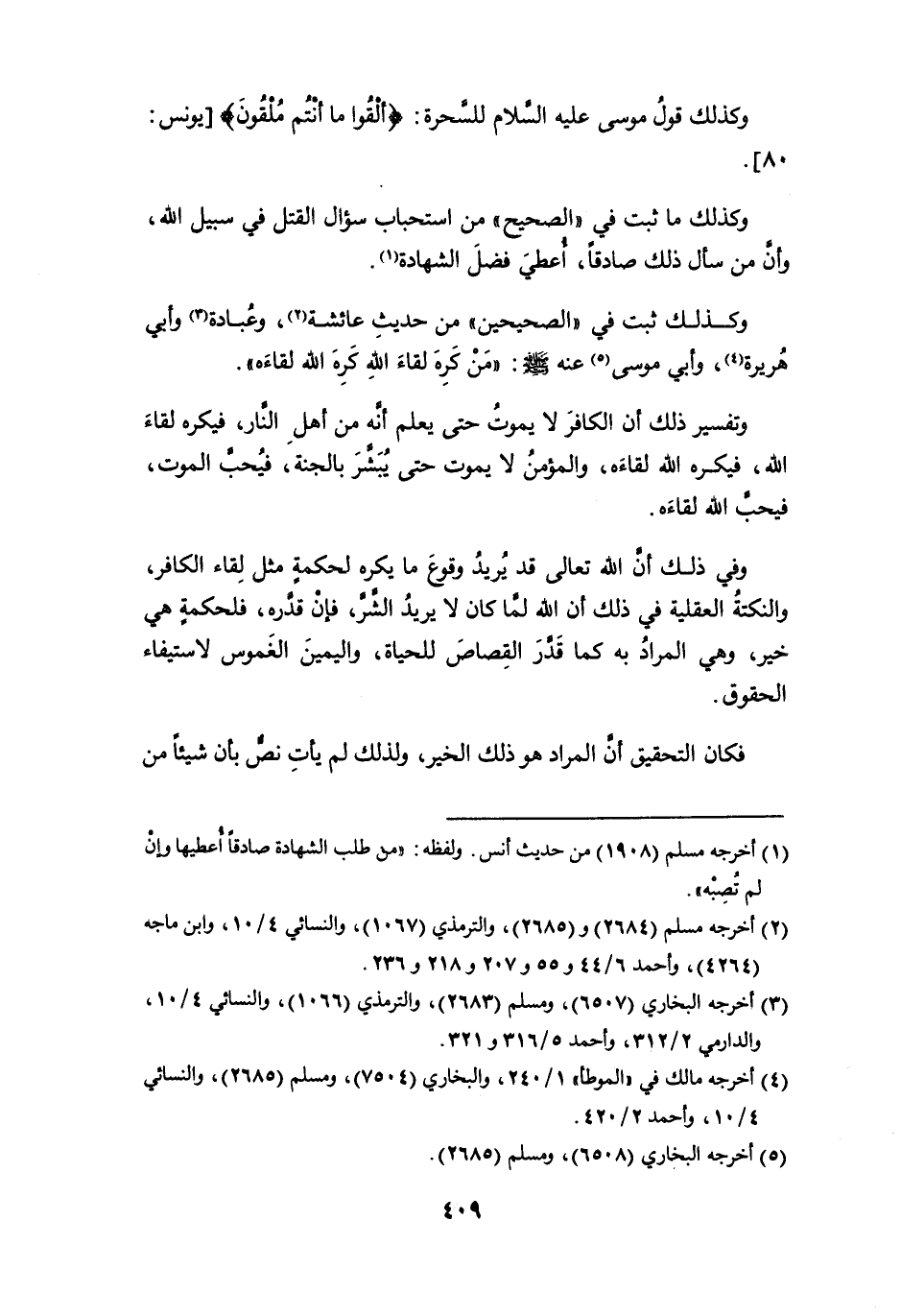 وكذلك ثبت في " الصحيحين " من حديث عائشة (¬2)، وعُبادة (¬3) وأبي هريرة (¬4)، وأبي موسى (¬5) عنه - صلى الله عليه وسلم -: " مَنْ كَرِهَ لقاء الله كَرِهَ الله لقاءه ".