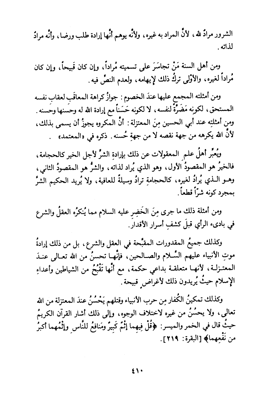 وكذلك جميع المقدورات المقبَّحة في العقل والشرع، بل من ذلك إرادة موت الأنبياء عليهم السلام والصالحين، فإنها تحسنُ من الله تعالى عند المعتزلة، لأنها متعلقة بداعي حكمة، مع أنها تقبُحُ من الشياطين وأعداءِ الإسلام حيث يُريدون ذلك لأغراض قبيحة.