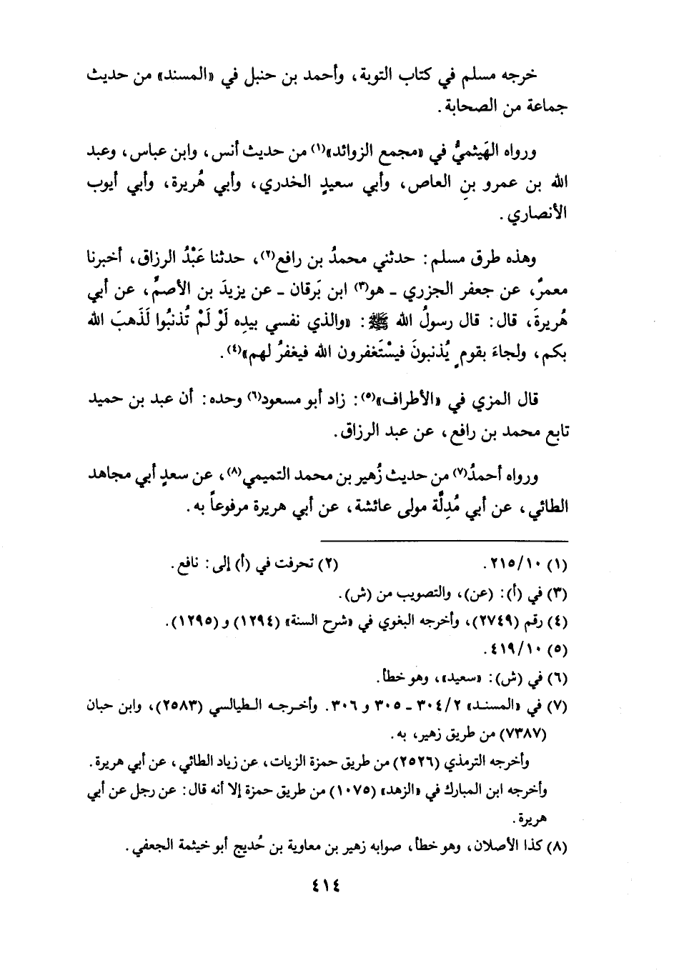 وهذه طرق مسلم: حدثني محمد بن رافع (¬2)، حدثنا عبد الرزاق، أخبرنا معمر، عن جعفر الجزري -هو (¬3) ابن برقان- عن يزيد بن الأصمِّ، عن أبي هُريرة، قال: قال رسول الله - صلى الله عليه وسلم -: " والذي نفسي بيده لو لم تذنبوا لذهب الله بكم، ولجاء بقومٍ يُذنبون فيستغفرون الله فيغفرُ لهم " (¬4).