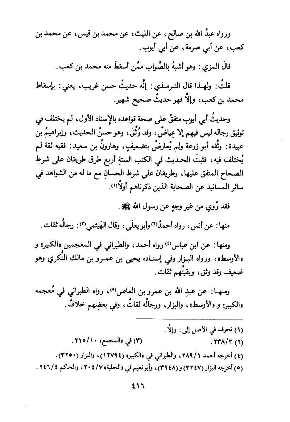 وحديث أبي أيوب متفقٌ على صحة قواعده بالإسناد الأول، لم يختلف في توثيق رجاله ليس فيهم إلاَّ عِياضٌ، وقد وُثِّق، وهو حسن الحديث، وإبراهيم بن عبيدة: وثَّقه أبو زرعة ولم يُعارض بتضعيفٍ، وهارون بن سعيد: فقيه ثقة لم يختلف فيه، فثبت الحديث في الكتب الستة أربع طرق طريقان على شرط الصحاح المتفق عليها، وطريقان على شرط الحسان مع ما له من الشواهد في سائر المسانيد عن الصحابة الذين ذكرناهم أولاً (¬1).