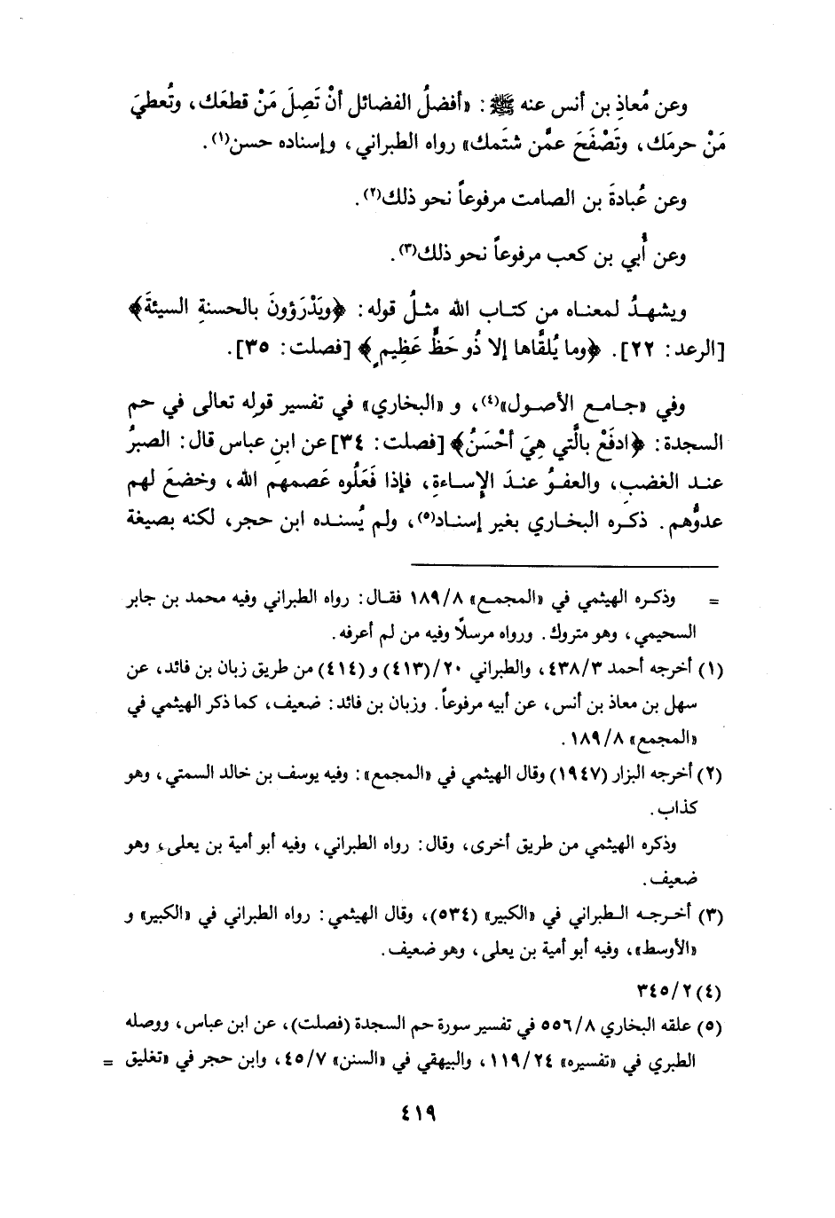 ويشهدُ لمعناه من كتاب الله مثل قوله: {ويَدْرَؤونَ بالحسنةِ السيئةَ} [الرعد: 22]. {وما يُلقَّاها إلاَّ ذُو حَظٍّ عَظِيمٍ} [فصلت: 35].
