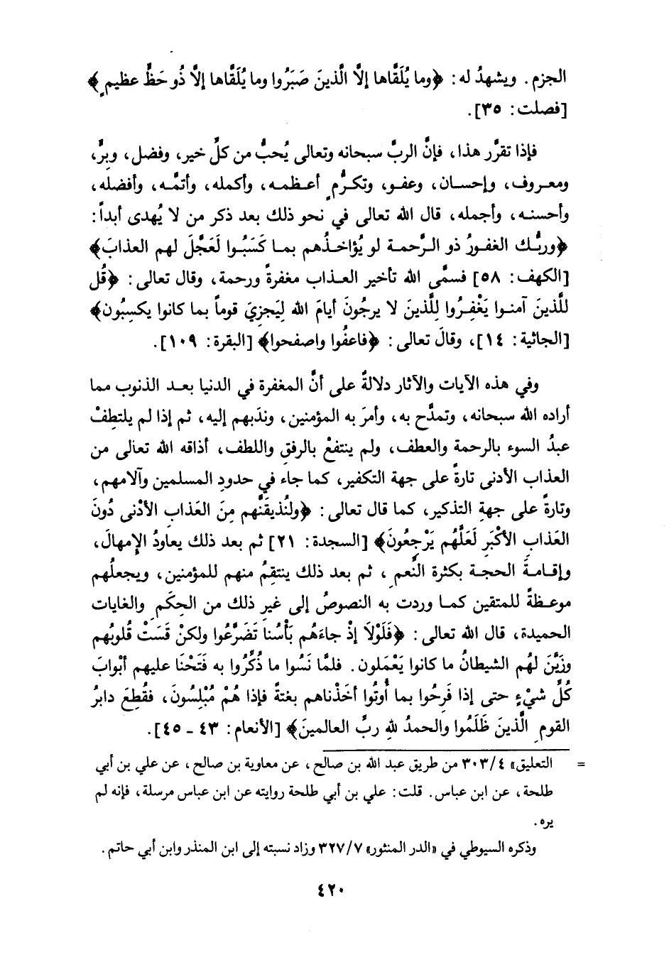 فإذا تقرَّر هذا، فإن الرب سبحانه وتعالى يحب من كل خير، وفضل، وبِرٍّ، ومعروف، وإحسان، وعفو، وتكرُّم أعظمه، وأكمله، وأتمه، وأفضله، وأحسنه، وأجمله، قال الله تعالى في نحو ذلك بعد ذكر من لا يُهدى أبداً: {وَرَبُّكَ الْغَفُورُ ذُو الرَّحْمَةِ لَوْ يُؤَاخِذُهُمْ بِمَا كَسَبُوا لَعَجَّلَ لَهُمُ الْعَذَابَ} [الكهف: 58] فسمى الله تأخير العذاب مغفرة ورحمة، وقال تعالى: {قُلْ لِلَّذِينَ آمَنُوا يَغْفِرُوا لِلَّذِينَ لَا يَرْجُونَ أَيَّامَ اللَّهِ لِيَجْزِيَ قَوْمًا بِمَا كَانُوا يَكْسِبُون} [الجاثية: 14]، وقال تعالى: {فاعفُوا واصفحوا} [البقرة: 109].