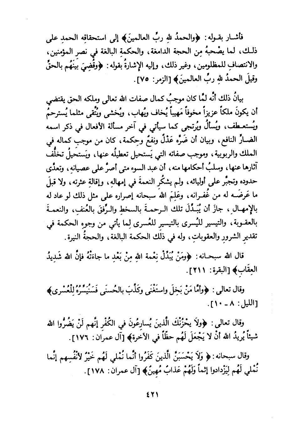 بيان ذلك أنه لما كان موجب كمال صفات الله تعالى وملكه الحق يقتضي أن يكون ملكاً عزيزاً مخوفاً مَهيباً يُخاف ويُهاب، ويُخشى ويُتَّقى مثلما يُسترحمُ ويُستعطف، ويُسأل ويُرتجى كما سيأتي في آخر مسألة الأفعال في ذكر اسمه الضار النافع، وبيان أن ضره عدلٌ ونفعٌ وحكمة، كان من موجب كماله في الملك والربوبية، وموجب صفاته التي يستحيل تعطيله عنها، ويستحيل تخلُّف آثارها عنها، وسلبُ أحكامها منه، أن عبد السوء متى أصرَّ على عصيانه، وتعدى حدوده وتجبَّر على أوليائه، ولم يشكر النعمة في إمهاله، وإقاله عثرته، ولا قبل ما عَرضَه له من غُفرانه، وعلم الله سبحانه إصراره على مثل ذلك لو عاد له بالإمهال، جاز أن يُبَدِّلَ تلك الرحمة بالسخط والرفق بالعُنف، والنعمة بالعقوبة، والتيسير لليسرى بالتيسير للعسرى لما يأتي من وجوه الحكمة في تقدير الشرور والعقوبات، وله في ذلك الحكمة البالغة، والحجة النيرة.
