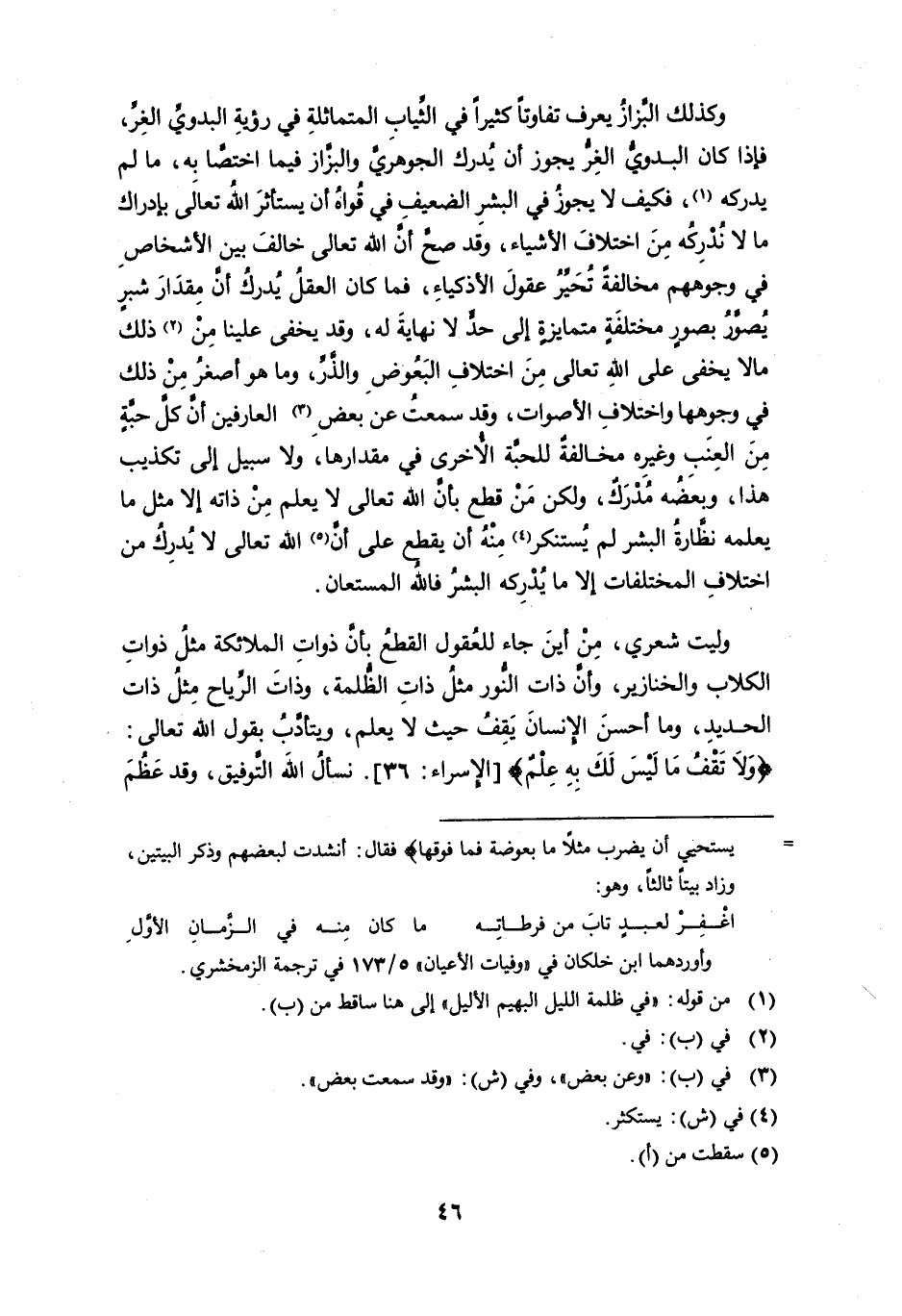 وليت شعري، من أين جاء للعقول القطع بأن ذوات الملائكة مثل ذوات الكلاب والخنازير، وأن ذات النور مثل ذات الظلمة، وذات الرياح مثل ذات الحديد، وما أحسن الإنسان يَقِفُ حيث لا يعلم، ويتأدَّبُ بقول الله تعالى: {ولا تَقْفُ ما ليسَ لَكَ به عِلْمٌ} [الإسراء: 36]. نسأل الله التوفيق، وقد عَظُمَ