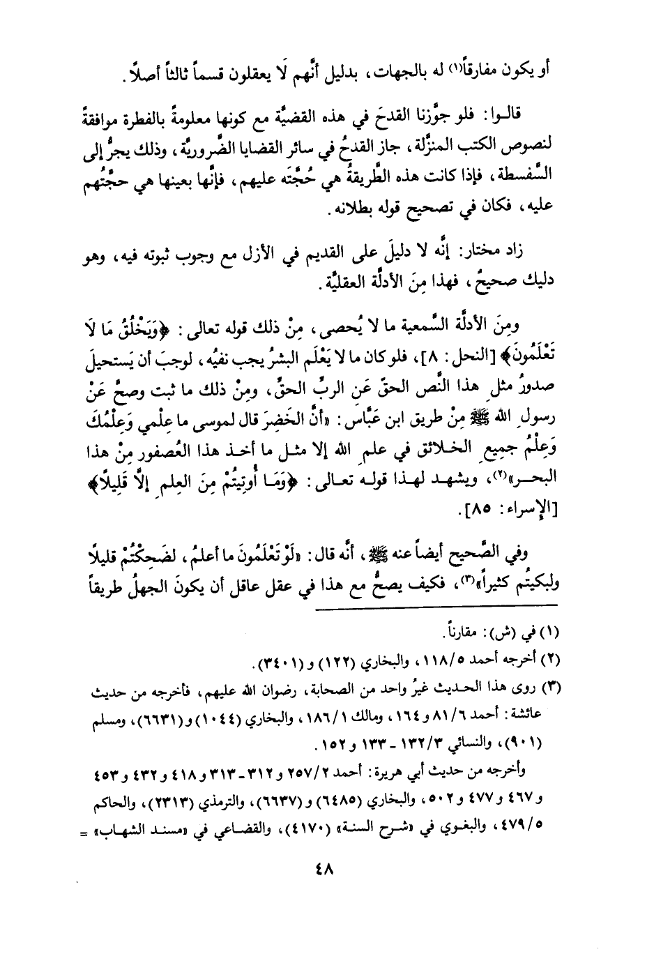ومن الأدلة السمعية ما لا يُحصى، من ذلك قوله تعالى: {وَيَخلُقُ مَا لا تعلَمُون} [النحل: 8]، فلو كان ما لا يعلم البشر يجب نفيه، لوجب أن يستحيل صدور مثل هذا النص الحقِّ عن الربِّ الحقِّ، ومن ذلك ما ثبث وصحَّ عن رسول الله - صلى الله عليه وسلم - من طريق ابن عباس: " أن الخَضِرَ قال لموسى ما علمي وعِلمُكَ وعِلْمُ جميع الخلائق في علم الله إلاَّ مثل ما أخذ هذا العصفور من هذا البحر " (¬2)، ويشهد لهذا قوله تعالى: {وما أُوتِيتُمْ مِنَ العِلمِ إلاَّ قَليِلاً} [الإسراء: 85].