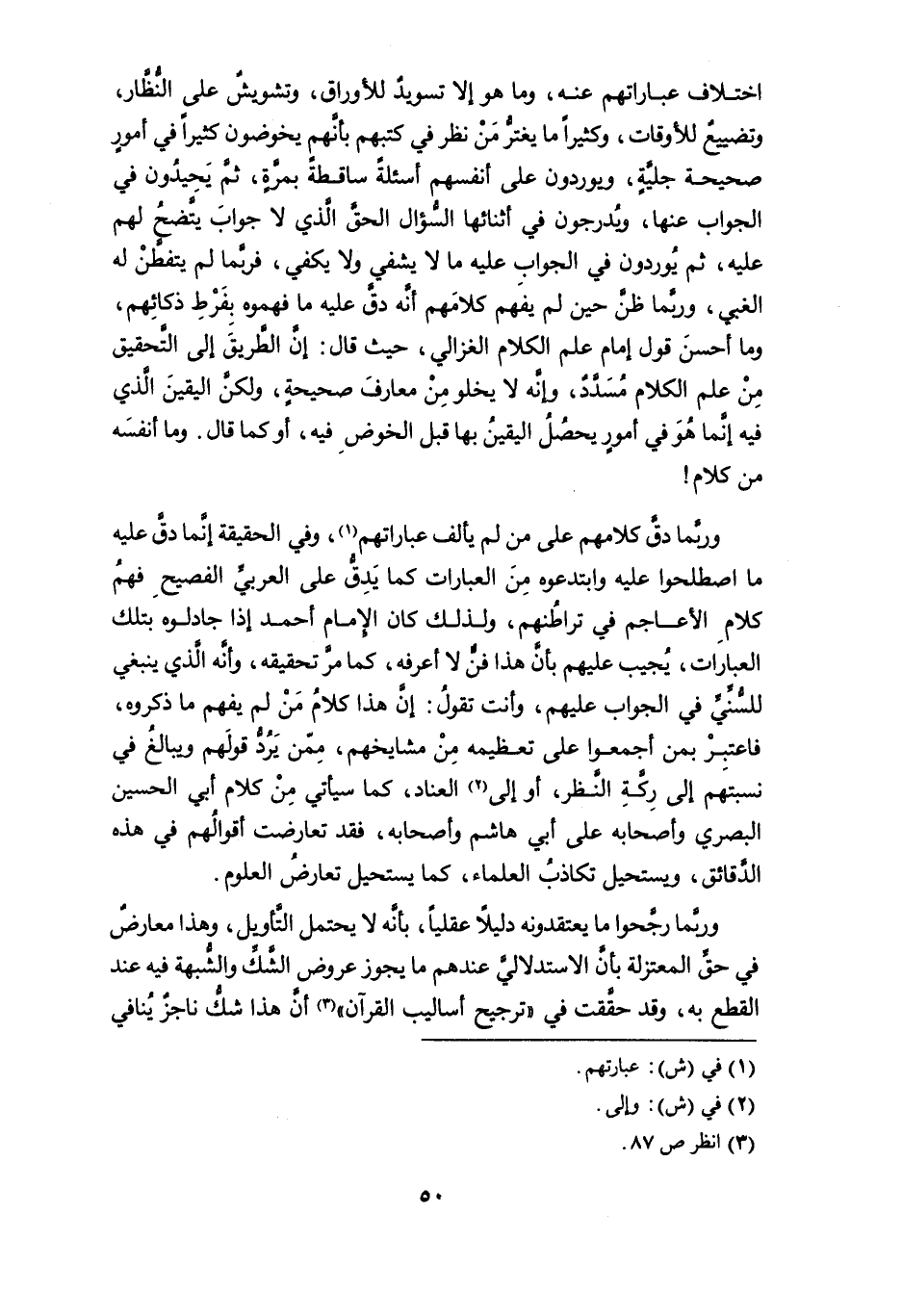 اختلاف عباراتهم عنه، وما هو إلاَّ تسويدٌ للأوراق، وتشويشٌ على النُّظَّار، وتضييعٌ للأوقات، وكثيراً ما يغترُّ من نظر في كتبهم بأنهم يخوضون كثيراً في أمورٍ صحيحة جليَّةٍ، ويوردون على أنفسهم أسئلة ساقطة بمرَّةٍ، ثم يَحيدُون في الجواب عنها، ويُدرجون في أثنائها السؤال الحق الذي لا جواب يتَّضحُ لهم عليه، ثم يُوردون في الجواب عليه ما لا يشفي ولا يكفي، فربما لم يتفطن له الغبي، وربما ظن حين لم يفهم كلامهم أنه دقَّ عليه ما فهموه بفرط ذكائهم، وما أحسن قول إمام علم الكلام الغزالي، حيث قال: إنَّ الطريق إلى التحقيق من علم الكلام مسدد، وإنه لا يخلو من معارف صحيحةٍ، ولكن اليقين الذي فيه إنَّما هُوَ في أمورٍ يحصُلُ اليقين بها قبل الخوض فيه، أو كما قال. وما أنفسَه من كلام!