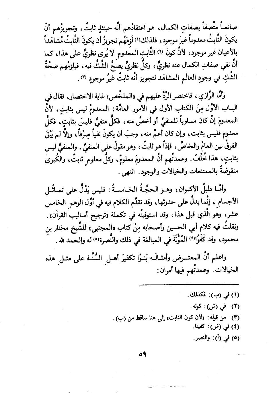 وأما الرازي، فاختصر الرد عليهم في " الملخص " غاية الاختصار، فقال في الباب الأول من الكتاب الأول في الأمور العامة: المعدوم ليس بثابتٍ، لأن المعدوم إن كان مساوياً للمنفيِّ أو أخصَّ منه، فكلُّ منفيٍّ فليس بثابتٍ، فكل معدوم فليس بثابت، وإن كان أعمَّ منه، وجب أن يكون نفياً صرفاً، وإلا لم يَبْقَ الفرق بين العام والخاص، فإذا هو ثابتٌ، وهو مقولٌ على المنفي، والمنفي ليس بثابتٍ، هذا خُلْفٌ. وعمدتهم أن المعدوم معلوم، وكل معلومٍ ثابتٌ، والكبرى منقوضةٌ بالممتنعات والخيالات والوجود. انتهى.