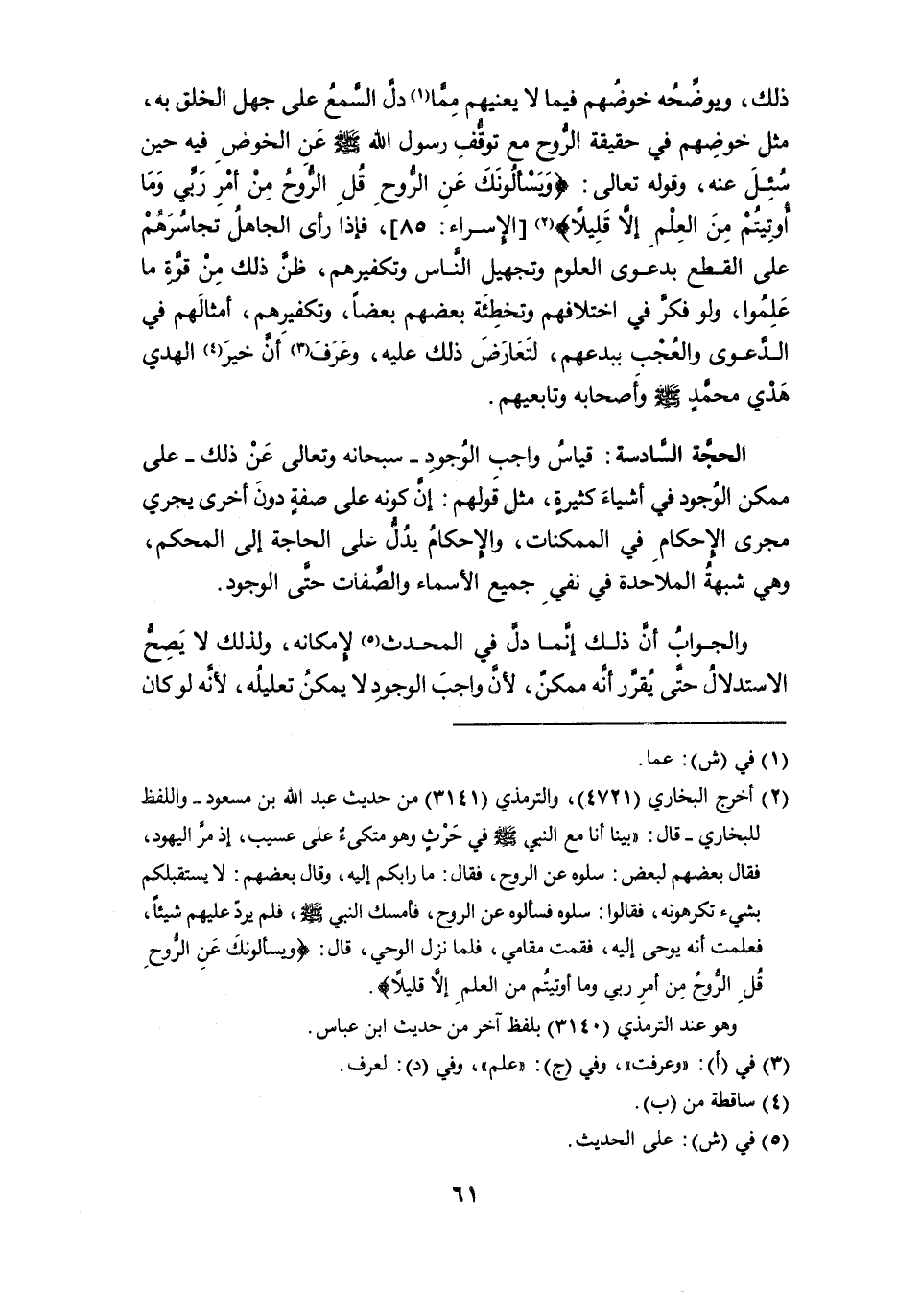 الحجة السادسة: قياس واجب الوجود -سبحانه وتعالى عن ذلك- على ممكن الوجود في أشياء كثيرة، مثل قولهم: إنَّ كونه على صفةٍ دون أخرى يجري مجرى الإحكام في الممكنات، والإحكام يدل على الحاجة إلى المحكم، وهي شبهة الملاحدة في نفي جميع الأسماء والصفات حتى الوجود.
