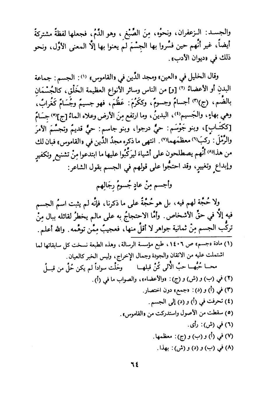 (¬1) مادة " جسم " ص 1406، طبع مؤسسة الرسالة، وهذه الطبعة نسخت كل سابقاتها لما اشتملت عليه من الاتقان والجودة وجمال الإخراج، وليس الخبر كالعيان.