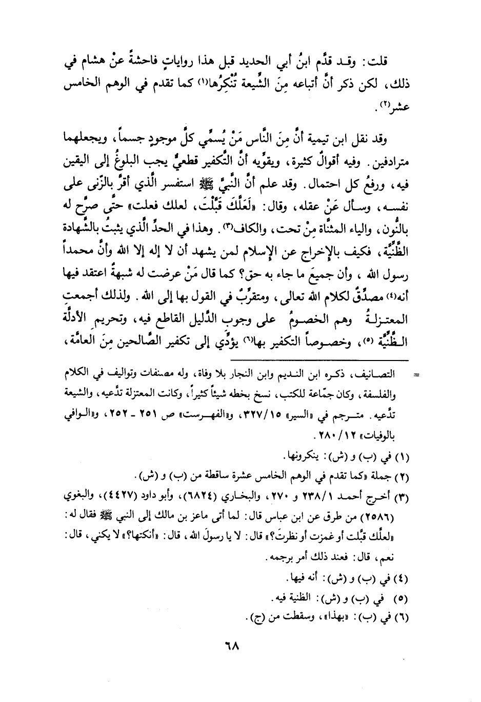 وقد نقل ابن تيمية أن من الناس من يُسمِّي كل موجودٍ جسماً، ويجعلهما مترادفين. وفيه أقوالٌ كثيرة، ويقويه أن التكفير قطعي يجب البلوغ إلى اليقين فيه، ورفع كل احتمال. وقد علم أن النبي - صلى الله عليه وسلم - استفسر الذي أقرَّ بالزنى على نفسه، وسأل عن عقله، وقال: " لعلَّكَ قَبَّلْتَ، لعلك فعلت " حتَّى صرَّح له بالنُّون، والياء المثناة من تحت، والكاف (¬3). وهذا في الحدِّ الذي يثبت بالشهادة الظنية، فكيف بالإخراج عن الإسلام لمن يشهد أن لا إله إلاَّ الله وأن محمداً رسول الله، وأن جميع ما جاء به حق؟ كما قال من عرضت له شبهةٌ اعتقد فيها أنه (¬4) مصدِّقٌ لكلام الله تعالى، ومتقرِّبٌ في القول بها إلى الله. ولذلك أجمعت المعتزلة وهم الخصوم على وجوب الدليل القاطع فيه، وتحريم الأدلة الظنية (¬5)، وخصوصاً التكفير بها (¬6) يؤدي إلى تكفير الصالحين من العامة،
