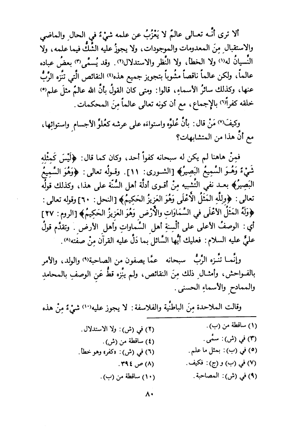 فمن ها هنا لم يكن له سبحانه كفواً أحد، وكان كما قال: {لَيْسَ كَمِثْلِهِ شَيءٌ وهو السَّمِيعُ البَصِيرُ} [الشورى: 11]. وقوله تعالى: {وهُوَ السَّمِيعُ البَصِيرُ} بعد نفي التشبيه من أقوى أدلَّة أهل السنة على هذا، وكذلك قوله تعالى: {وللهِ المَثَلُ الأعلى وهُوَ العزيزُ الحكيمُ} [النحل: 6] وقوله تعالى: {وَلَهُ الْمَثَلُ الْأَعْلَى فِي السَّمَاوَاتِ وَالْأَرْضِ وَهُوَ الْعَزِيزُ الْحَكِيمُ} [الروم: 27] أي: الوصفُ الأعلى على ألسِنةِ أهل السماوات وأهل الأرض. وتقدم قول عليٍّ عليه السلام: فعليك أيها السائل بما دلَّ عليه القرآن من صفته (¬8).