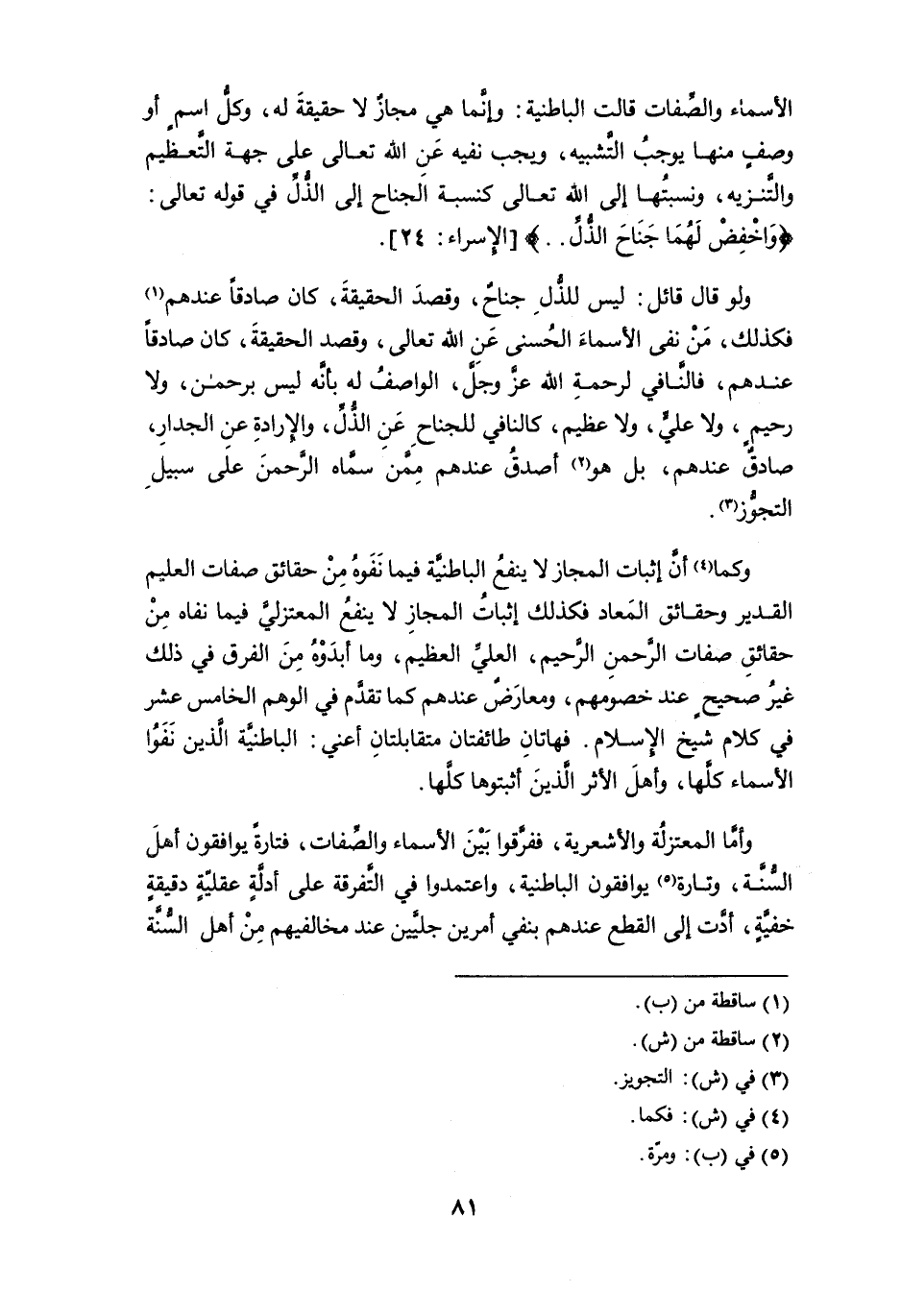الأسماء والصفات قالت الباطنية: وإنما هي مجازٌ لا حقيقة له، وكلُّ اسمٍ أو وصفٍ منها يوجب التَّشبيه، ويجب نفيه عن الله تعالى على جهة التعظيم والتنزيه، ونسبتها إلى الله تعالى كنسبة الجناح إلى الذُّلِّ في قوله تعالى: {واخفِضْ لَهُمَا جَنَاحَ الذُّلِّ .. } [الإسراء: 24].