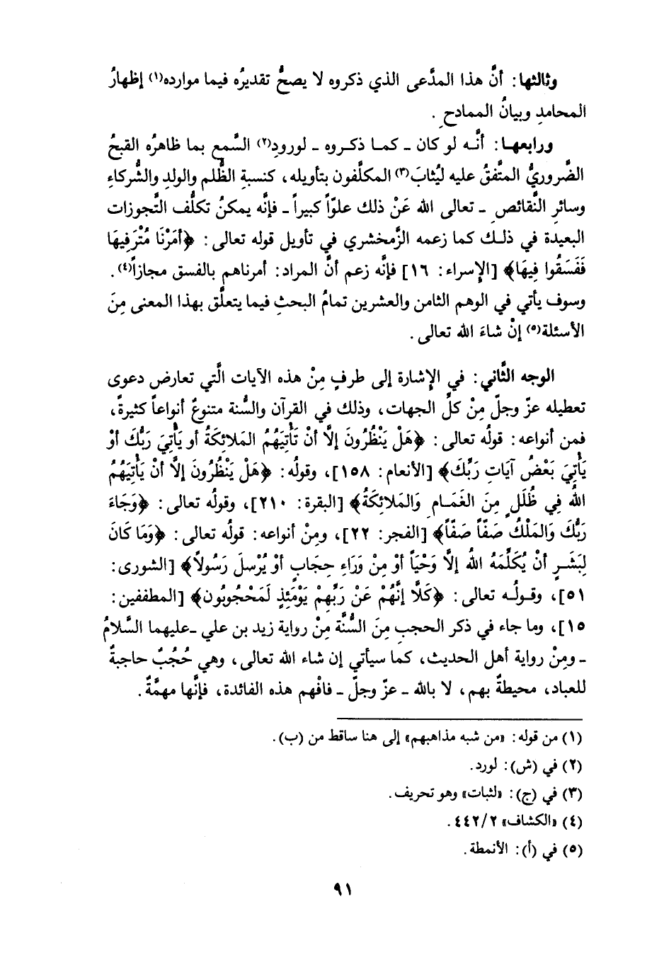 الوجه الثاني: في الإشارة إلى طرفٍ من هذه الآيات التي تعارض دعوى تعطيله عزَّ وجلَّ من كل الجهات، وذلك في القرآن والسنة متنوعٌ أنواعاً كثيرة، فمن أنواعه: قوله تعالى: {هَلْ يَنْظُرُونَ إِلَّا أَنْ تَأْتِيَهُمُ الْمَلَائِكَةُ أَوْ يَأْتِيَ رَبُّكَ أَوْ يَأْتِيَ بَعْضُ آيَاتِ رَبِّكَ} [الأنعام: 158]، وقولُه: {هَلْ يَنْظُرُونَ إِلَّا أَنْ يَأْتِيَهُمُ اللَّهُ فِي ظُلَلٍ مِنَ الْغَمَامِ وَالْمَلَائِكَةُ} [البقرة: 210]، وقوله تعالى: {وَجَاءَ رَبُّكَ وَالْمَلَكُ صَفًّا صَفًّا} [الفجر: 22]، ومن أنواعه: قوله تعالى: {وَمَا كَانَ لِبَشَرٍ أَنْ يُكَلِّمَهُ اللَّهُ إِلَّا وَحْيًا أَوْ مِنْ وَرَاءِ حِجَابٍ أَوْ يُرْسِلَ رَسُولًا} [الشورى: 51]، وقوله تعالى: {كَلَّا إِنَّهُمْ عَنْ رَبِّهِمْ يَوْمَئِذٍ لَمَحْجُوبُونَ} [المطففين: 15]، وما جاء في ذكر الحجب من السنة من رواية زيد بن علي -عليهما السلام- ومن رواية أهل الحديث، كما سيأتي إن شاء الله تعالى، وهي حُجُبٌ حاجبةٌ للعباد، محيطةٌ بهم، لا بالله -عزَّ وجلَّ- فافْهم هذه الفائدة، فإنها مهمَّة.
