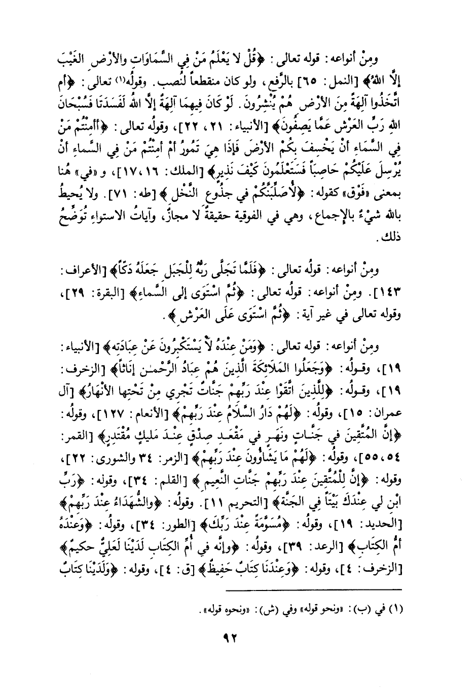 ومن أنواعه: قوله تعالى: {قُلْ لَا يَعْلَمُ مَنْ فِي السَّمَاوَاتِ وَالْأَرْضِ الْغَيْبَ إِلَّا اللَّهُ} [النمل: 65] بالرَّفع، ولو كان منقطعاً لنُصب. وقوله (¬1) تعالى: {أَمِ اتَّخَذُوا آلِهَةً مِنَ الْأَرْضِ هُمْ يُنْشِرُونَ (21) لَوْ كَانَ فِيهِمَا آلِهَةٌ إِلَّا اللَّهُ لَفَسَدَتَا فَسُبْحَانَ اللَّهِ رَبِّ الْعَرْشِ عَمَّا يَصِفُونَ} [الأنبياء: 21، 22]، وقوله تعالى: {أَأَمِنْتُمْ مَنْ فِي السَّمَاءِ أَنْ يَخْسِفَ بِكُمُ الْأَرْضَ فَإِذَا هِيَ تَمُورُ (16) أَمْ أَمِنْتُمْ مَنْ فِي السَّمَاءِ أَنْ يُرْسِلَ عَلَيْكُمْ حَاصِبًا فَسَتَعْلَمُونَ كَيْفَ نَذِيرِ} [الملك: 16، 17]، و" في " هنا بمعنى " فوق " كقوله: {لَأُصَلِّبَنَّكُمْ فِي جُذُوعِ النَّخْلِ} [طه: 71]. ولا يُحيط بالله شيءٌ بالإجماع، وهي في الفوقية حقيقةٌ لا مجازٌ، وآيات الاستواء تُوَضِّحُ ذلك.