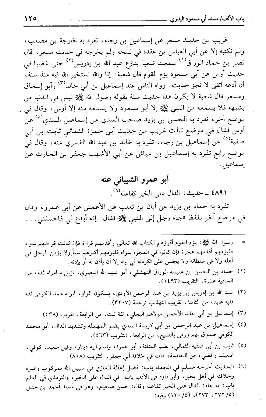 غَرِيب من حَدِيث مسعر عَن إِسْمَاعِيل بن رَجَاء، تفرد بِهِ خَارِجَة بن مُصعب، وَلم نَكْتُبهُ إِلَّا عَن أبي الْعَبَّاس بن عقدَة فِي نسخه وَلم يُخرجهُ فِي حَدِيث مسعر، قَالَ نصر بن حَمَّاد الْوراق سَمِعت شُعْبَة يُنَازع عبد الله بن إِدْرِيس حَتَّى غَضبا فِي حَدِيث أَوْس عَن أبي مَسْعُود يؤم الْقَوْم قَالَ شُعْبَة: إِنَّا وَالله نستخير الله فِيهِ مُنْذُ سنة، أَن أَدَعهُ اتَّقى لَا تجز حَدِيث. رَوَاهُ النَّاس عِنْد إِسْمَاعِيل بن أبي خَالِد وَأَبُو إِسْحَاق ومسعر قَالَ شُعْبَة لَا يكون هَذَا حَدِيث سنة يَقُول رَسُول الله لَيْسَ فِي الدُّنْيَا من يُشبههُ فَلَا يسمعهُ من النَّبِي إِلَّا أَبُو مَسْعُود وَلَا يسمعهُ مِنْهُ إِلَّا أَوْس، وَقَالَ فِي مَوضِع آخر، تفرد بِهِ الْحسن بن يزِيد صَاحب السّديّ عَن إِسْمَاعِيل السّديّ عَن أَوْس فَقَالَ فِي مَوضِع ثَالِث غَرِيب من حَدِيث أبي حَمْزَة الثمالِي ثَابت بن أبي صَفِيَّة عَن إِسْمَاعِيل بن رَجَاء، تفرد بِهِ خَالِد بن عبد الله الْقَسرِي عَنهُ، وَقَالَ فِي مَوضِع رَابِع تفرد بِهِ إِسْمَاعِيل بن عَيَّاش عَن أبي الْأَشْهب جَعْفَر بن الْحَارِث عَن إِسْمَاعِيل.