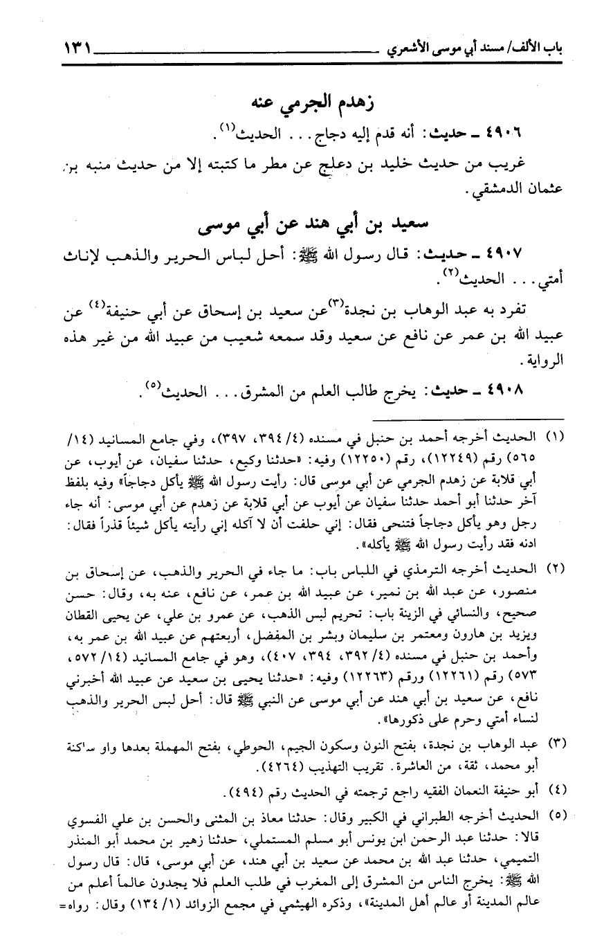 4907 - حَدِيث: قَالَ رَسُول الله: أحل لِبَاس الْحَرِير وَالذَّهَب لإناث أمتِي ... الحَدِيث.