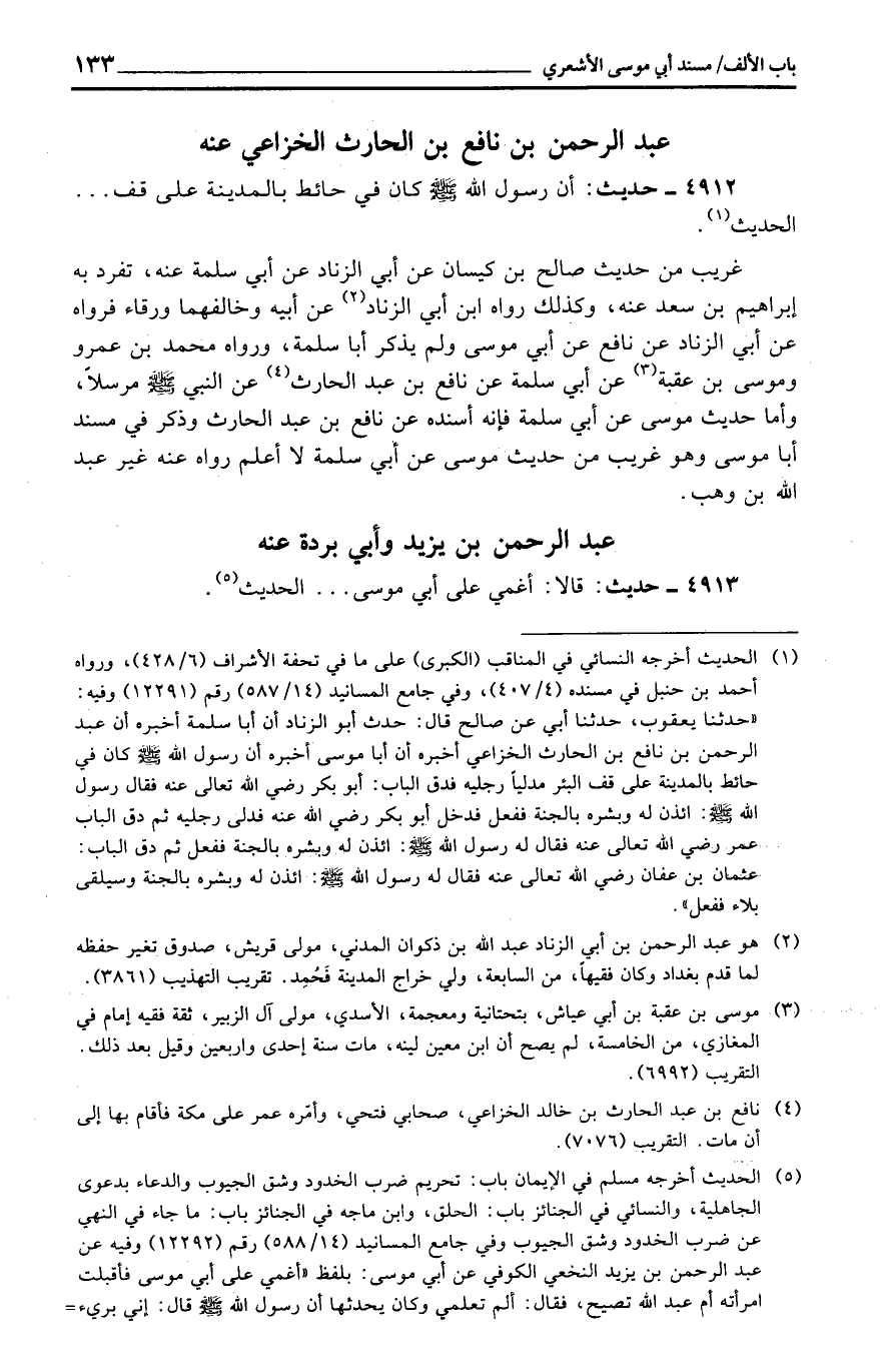 غَرِيب من حَدِيث صَالح بن كيسَان عَن أبي الزِّنَاد عَن أبي سَلمَة عَنهُ، تفرد بِهِ إِبْرَاهِيم بن سعد عَنهُ، وَكَذَلِكَ رَوَاهُ ابْن أبي الزِّنَاد عَن أَبِيه وَخَالَفَهُمَا وَرْقَاء فَرَوَاهُ عَن أبي الزِّنَاد عَن نَافِع عَن أبي مُوسَى وَلم يذكر أَبَا سَلمَة، وَرَوَاهُ مُحَمَّد بن عَمْرو ومُوسَى بن عقبَة عَن أبي سَلمَة عَن نَافِع بن عبد الْحَارِث عَن النَّبِي مُرْسلا، وَأما حَدِيث مُوسَى عَن أبي سَلمَة فَإِنَّهُ أسْندهُ عَن نَافِع بن عبد الْحَارِث وَذكر فِي مُسْند أَبَا مُوسَى وَهُوَ غَرِيب من حَدِيث مُوسَى عَن أبي سَلمَة لَا أعلم رَوَاهُ عَنهُ غير عبد الله بن وهب.
