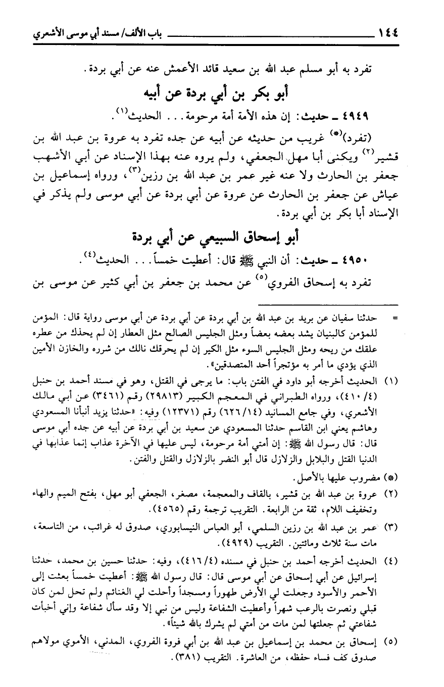 (تَفِر) غَرِيب من حَدِيثه عَن أَبِيه عَن جده تفرد بِهِ عُرْوَة بن عبد الله بن قُشَيْر ويكنى أَبَا مهل الْجعْفِيّ، وَلم يروه عَنهُ بِهَذَا الْإِسْنَاد عَن أبي الْأَشْهب جَعْفَر بن الْحَارِث وَلَا عَنهُ غير عمر بن عبد الله بن رزين، وَرَوَاهُ إِسْمَاعِيل بن عَيَّاش عَن جَعْفَر بن الْحَارِث عَن عُرْوَة عَن أبي بردة عَن أبي مُوسَى وَلم يذكر فِي الْإِسْنَاد أَبَا بكر بن أبي بردة.