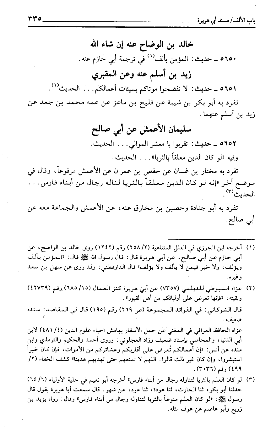 تفرد بِهِ مُخْتَار بن غَسَّان عَن حَفْص بن عمرَان عَن الْأَعْمَش مَرْفُوعا، وَقَالَ فِي مَوضِع آخر ((إِنَّه لَو كَانَ الدّين مُعَلّقا بِالثُّرَيَّا لَنَالَهُ رجال من أَبنَاء فَارس ... الحَدِيث.