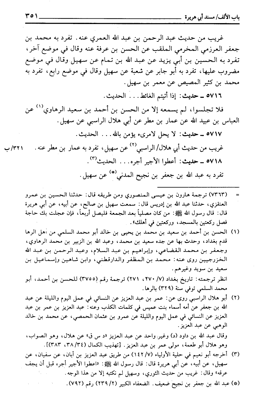 غَرِيب من حَدِيث عبد الرَّحْمَن بن عبد الله الْعمريّ عَنهُ. تفرد بِهِ مُحَمَّد بن جَعْفَر الْعَرْزَمِي الملقب عَن الْحسن بن عَرَفَة عَنهُ وَقَالَ فِي مَوضِع آخر، تفرد بِهِ الْحُسَيْن بن أبي يزِيد عَن عبد الله بن تَمام عَن سُهَيْل وَقَالَ فِي مَوضِع مَضْرُوب عَلَيْهَا، تفرد بِهِ أَبُو جَابر عَن شُعْبَة عَن سُهَيْل وَقَالَ فِي مَوضِع رَابِع، تفرد بِهِ مُحَمَّد بن كثير المصيص عَن معمر بن سُهَيْل.