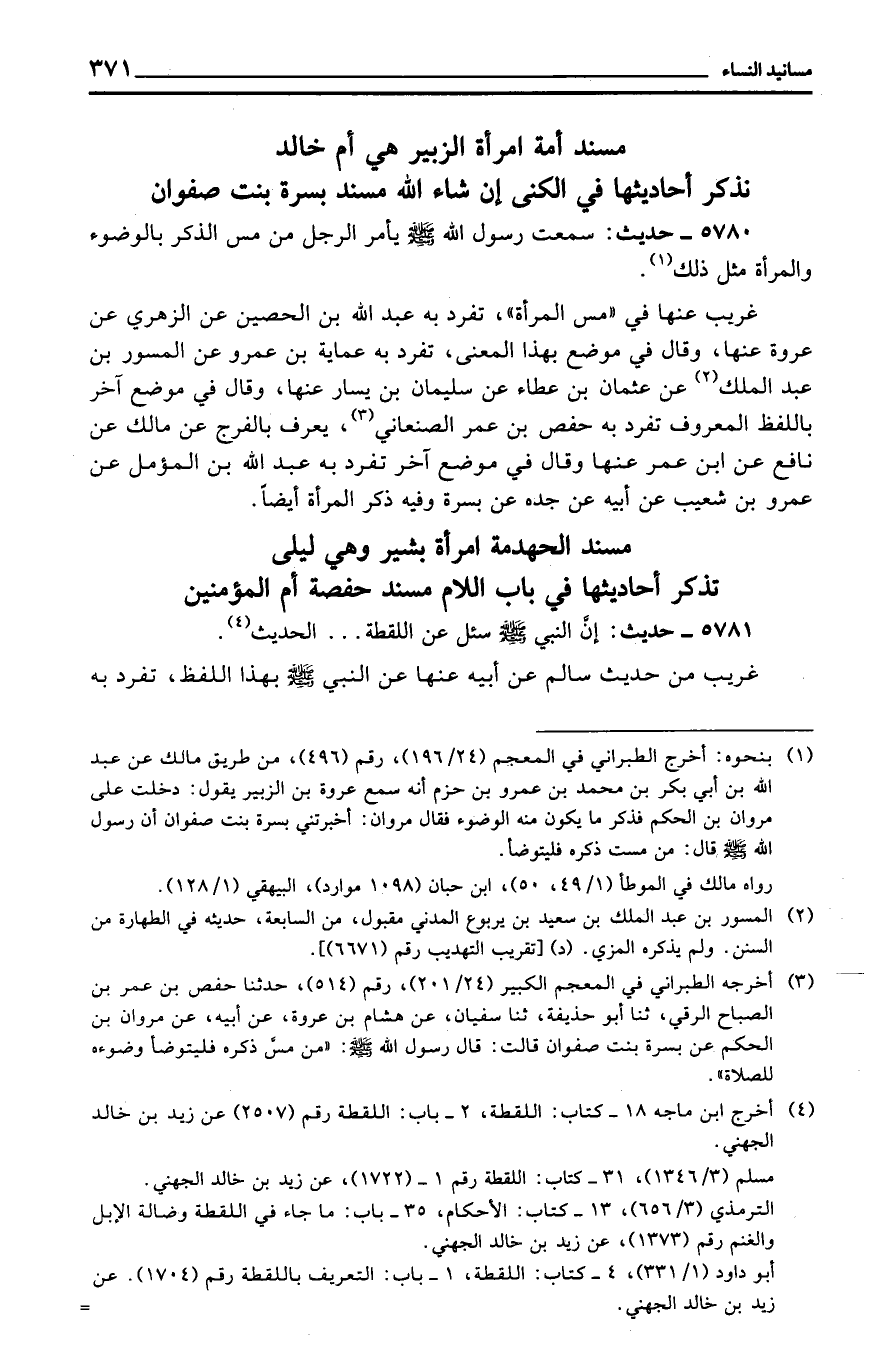 غَرِيب عَنْهَا فِي ((مس الْمَرْأَة)) ، تفرد بِهِ عبد الله بن الْحصين عَن الزُّهْرِيّ عَن عُرْوَة عَنْهَا، وَقَالَ فِي مَوضِع بِهَذَا الْمَعْنى، تفرد بِهِ عماية بن عَمْرو عَن الْمسور بن عبد الْملك عَن عُثْمَان بن عَطاء عَن سُلَيْمَان بن يسَار عَنْهَا، وَقَالَ فِي مَوضِع آخر بِاللَّفْظِ الْمَعْرُوف تفرد بِهِ حَفْص بن عمر الصَّنْعَانِيّ، يعرف بالفرج عَن مَالك عَن نَافِع عَن ابْن عمر عَنْهَا وَقَالَ فِي مَوضِع آخر تفرد بِهِ عبد الله بن المؤمل عَن عَمْرو بن شُعَيْب عَن أَبِيه عَن جده عَن بسرة وَفِيه ذكر الْمَرْأَة ايضا.