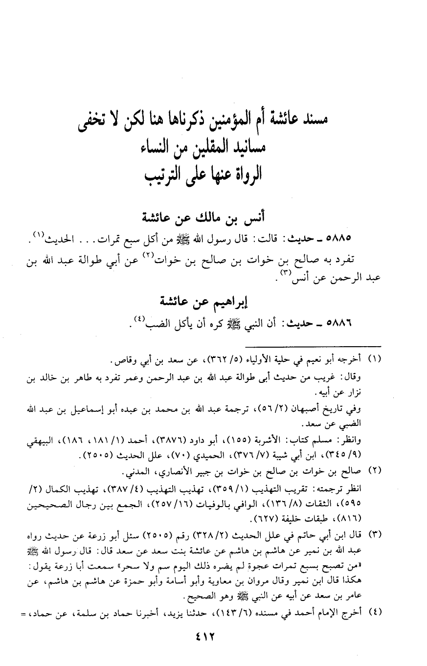 - مُسْند عَائِشَة أم المؤمين ذَكرنَاهَا هُنَا لَكِن لَا تحفى مسانيد المقلين من النِّسَاء الروَاة عَنْهَا على التَّرْتِيب