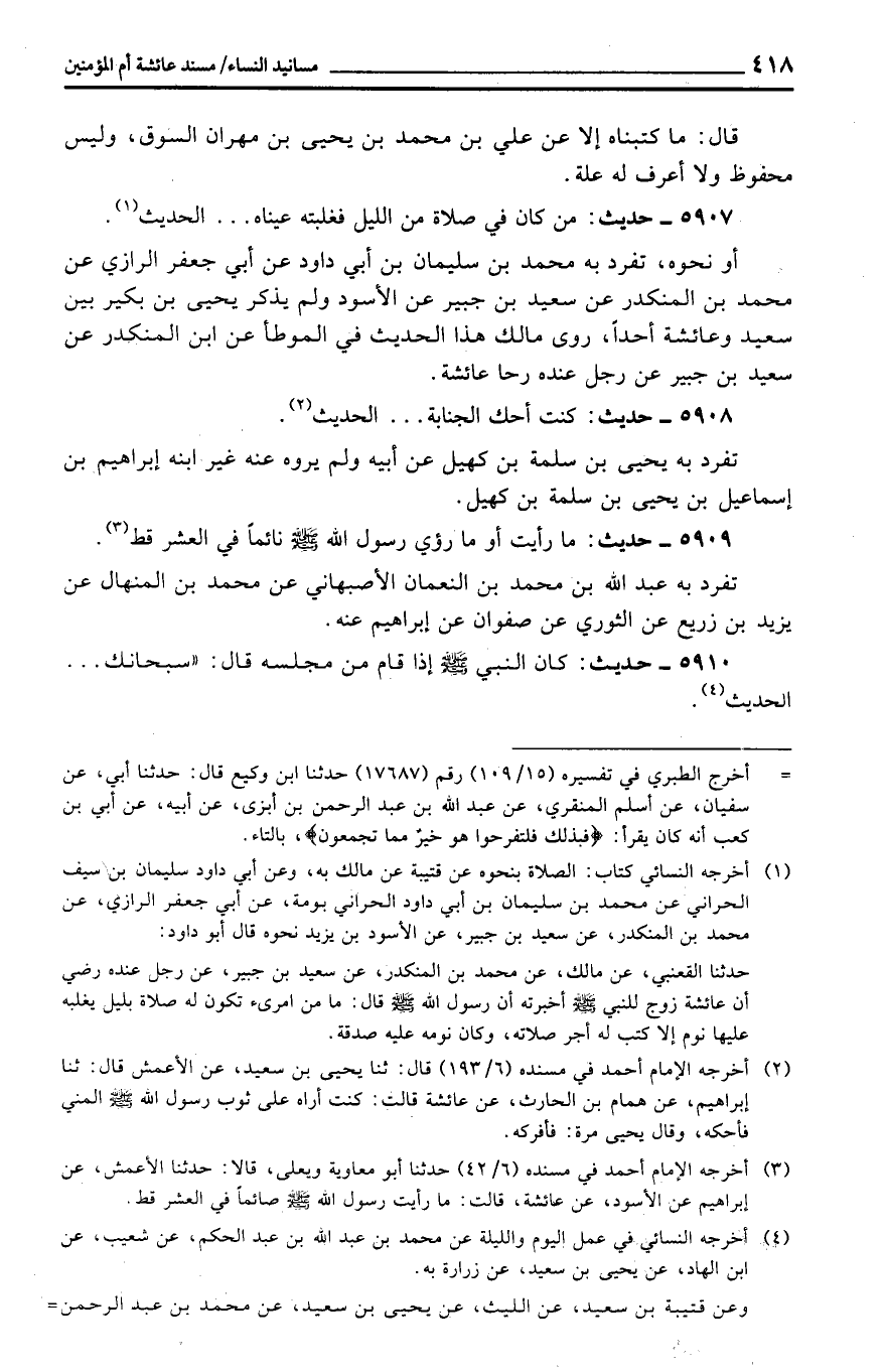 أَو نَحوه، تفرد بِهِ مُحَمَّد بن سُلَيْمَان بن أبي دَاوُد عَن أبي جَعْفَر الرَّازِيّ عَن مُحَمَّد بن الْمُنْكَدر عَن سعيد بن جُبَير عَن الْأسود وَلم يذكر يحيى بن بكير بَين سعيد وَعَائِشَة أحدا، وروى مَالك فِي هَذَا الحَدِيث فِي الْمُوَطَّأ عَن ابْن الْمُنْكَدر عَن سعيد بن جُبَير عَن رجل عِنْده رَحا عَائِشَة.